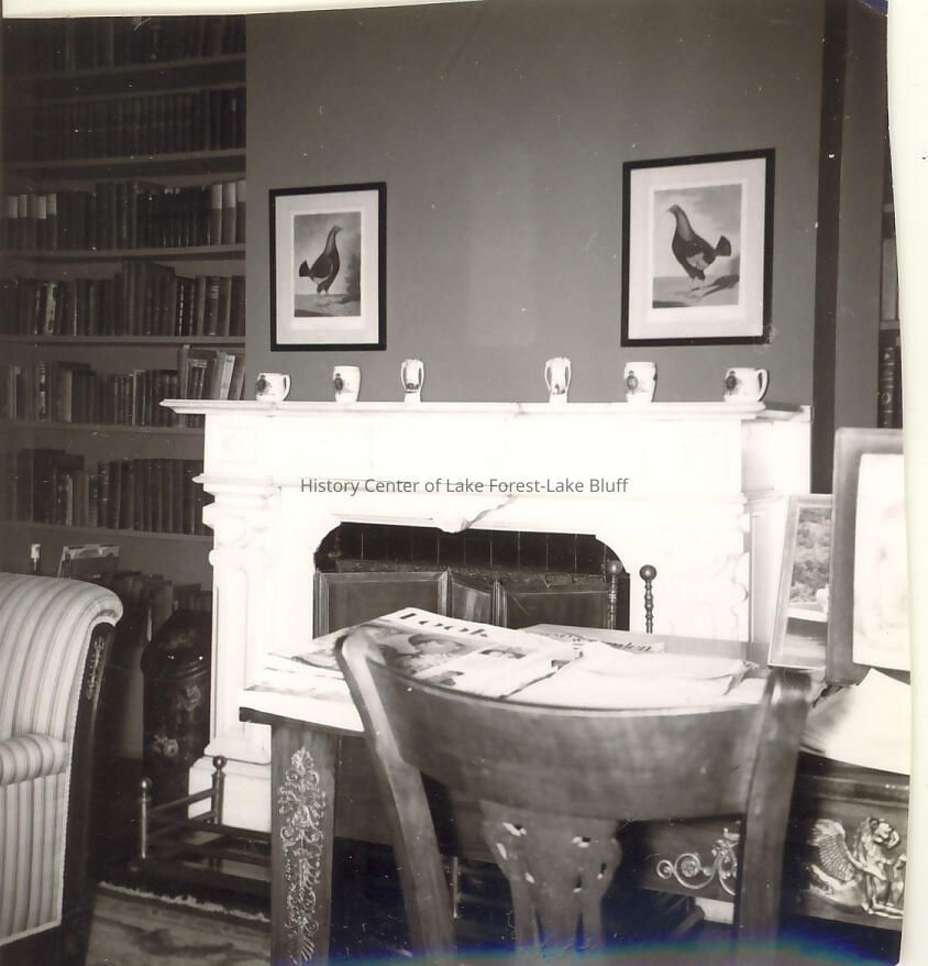 Interior image, general room-fireplace, collection of 6 mugs on fireplace mantel. partially-seen striped couch, partially-seen desk and desk chair, 2 fowl prints on facing wall, partially sheen built-in bookshelves