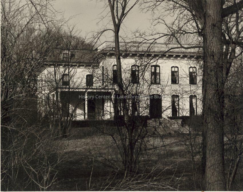 Black and white reprint and enlargement of the Quinlan home at 404 Deerpath. Trees in foreground.