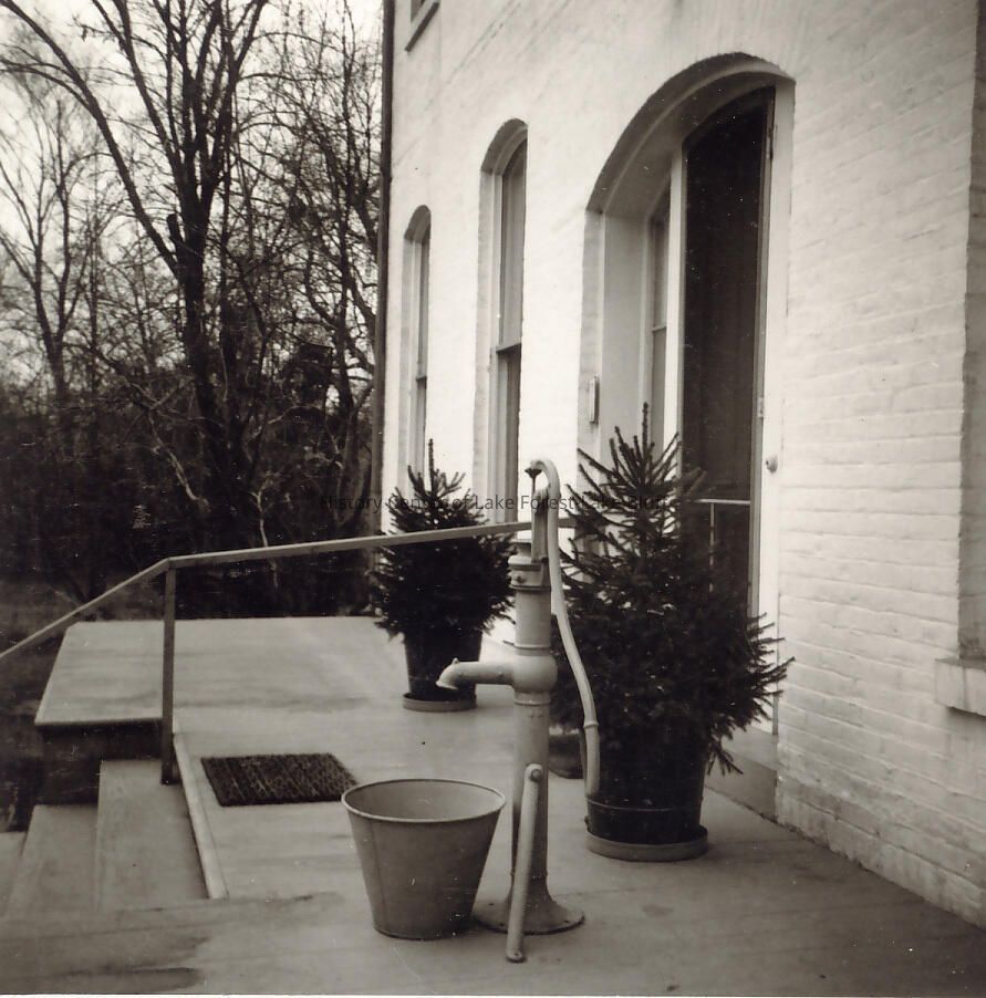 Exterior details: back door with pine trees and hand water pump and bucket.