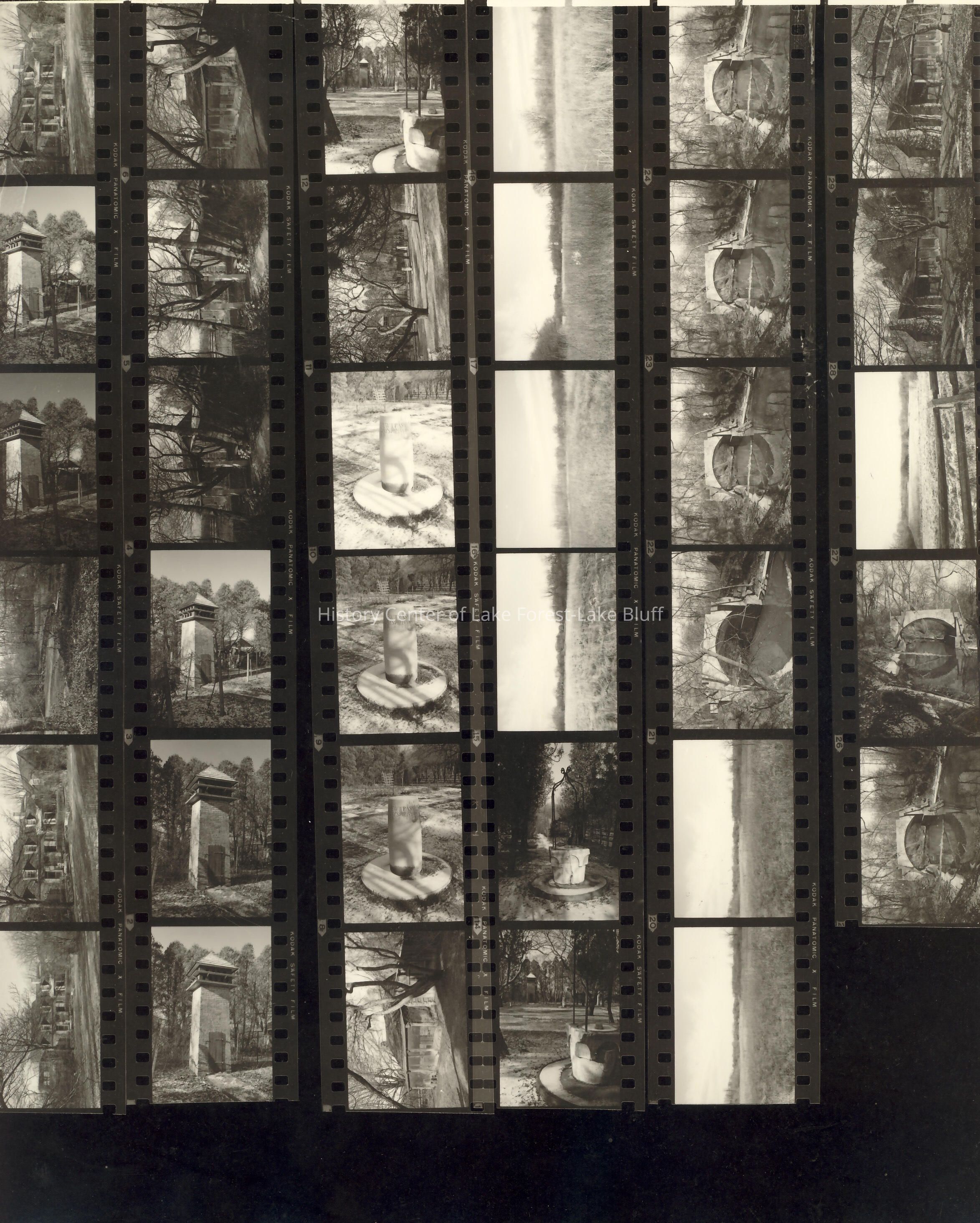 contact sheet of negatives- images of bridge, prairie, log cabin, pasture, dove cote, sundial, wishing well