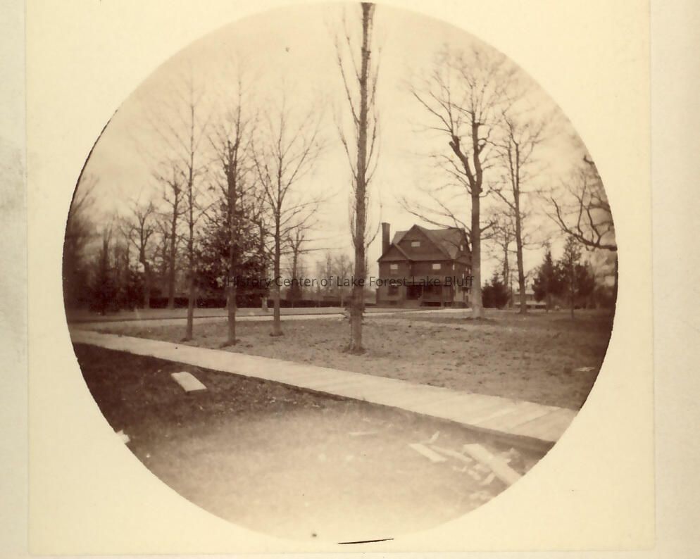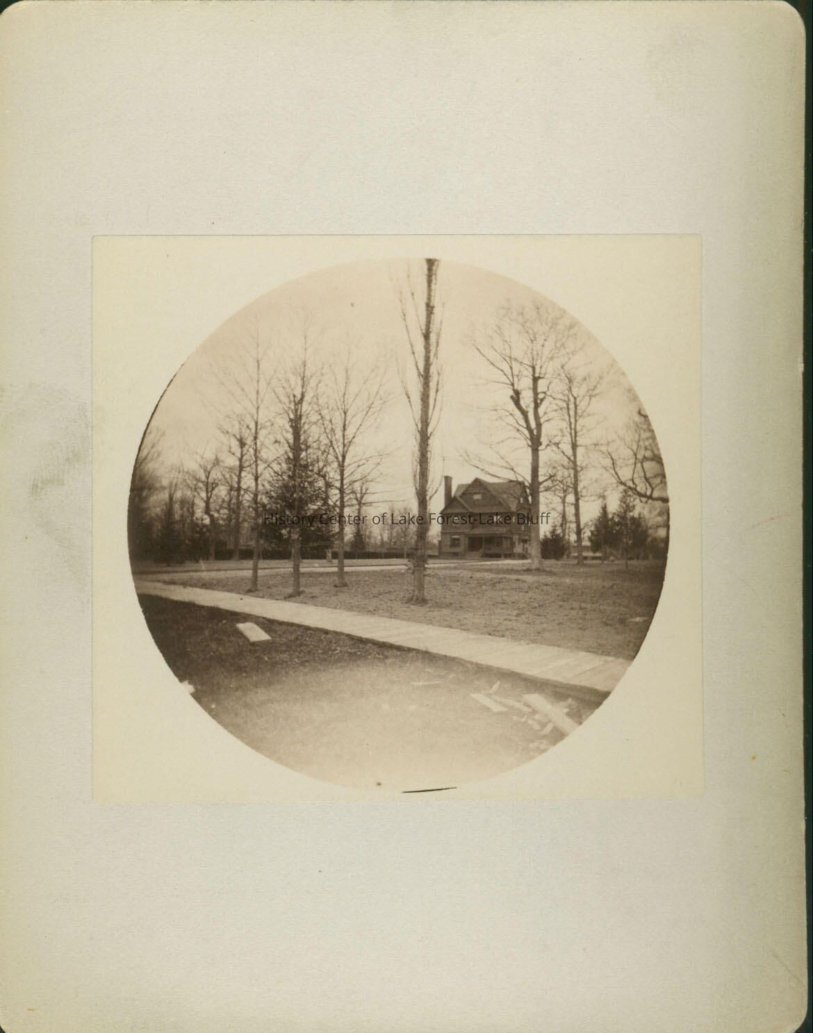 Three-story Queen Anne-style residence with peaked rooflines, at end of long drive. Possible location was at the southwest corner of Westminster and Sheridan Roads.There is a porch in front. April, 1889