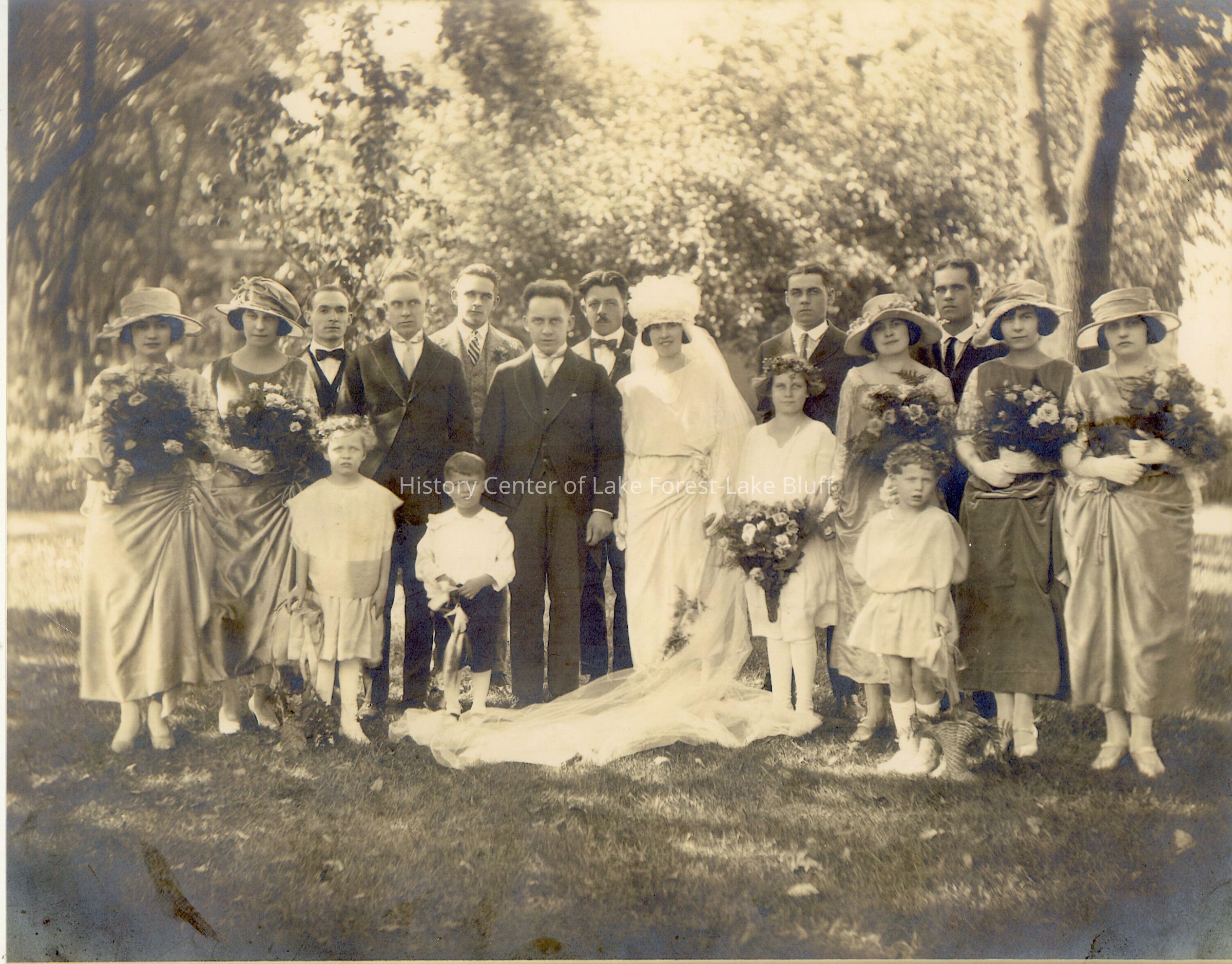 Reproduction of a black and white photo of the wedding party of Raymond Matthew Ketchum, Groom and Marie Engelbrecht, Bride