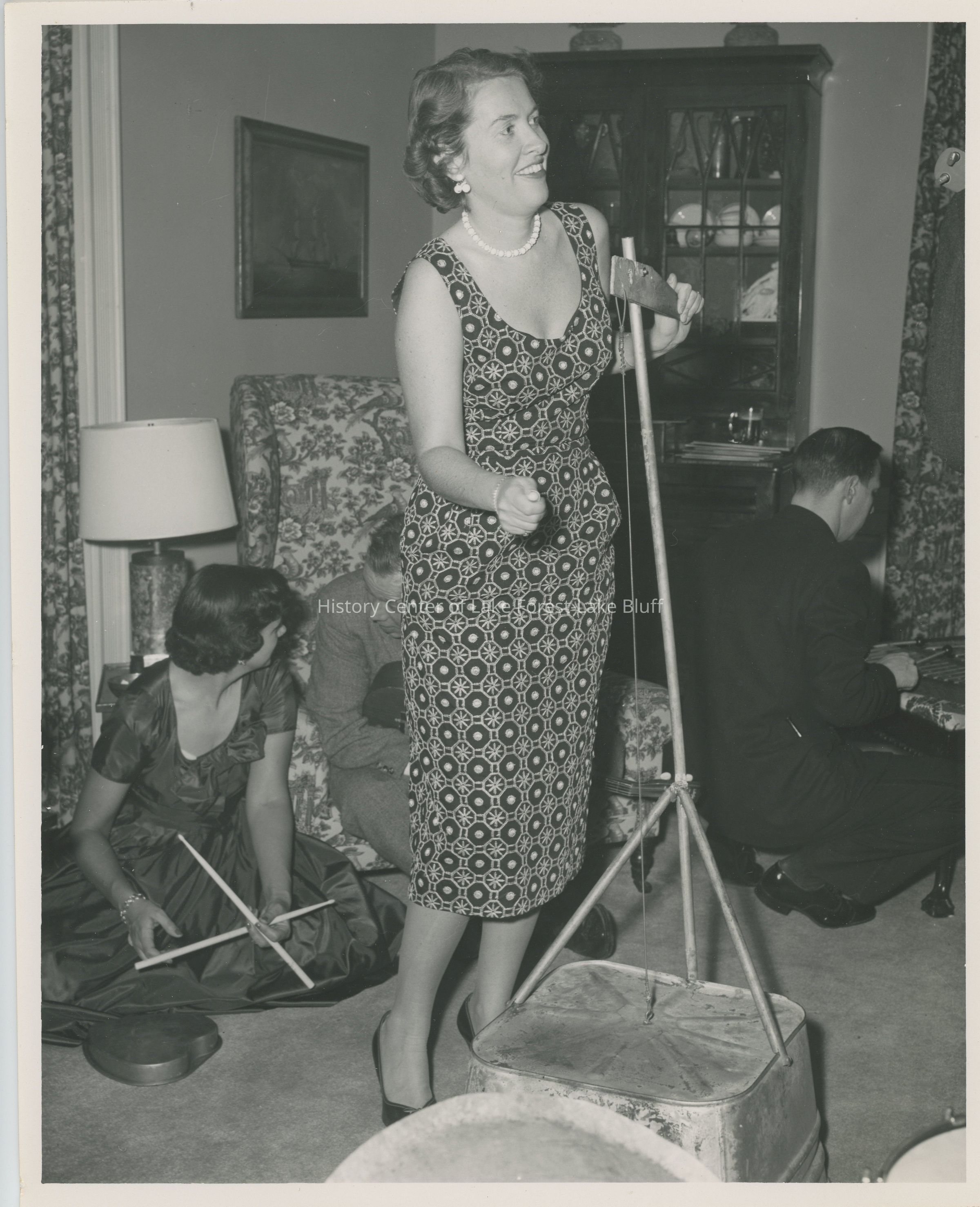 An image from the Requa Family Acting Troupe and Musical Group get together. It features Tita Bell playing the washtub bass, with Peggy Middleton and Sam Sherer sitting on the back left. Another figure sits on the right with their back turned, making it hard to identify them.