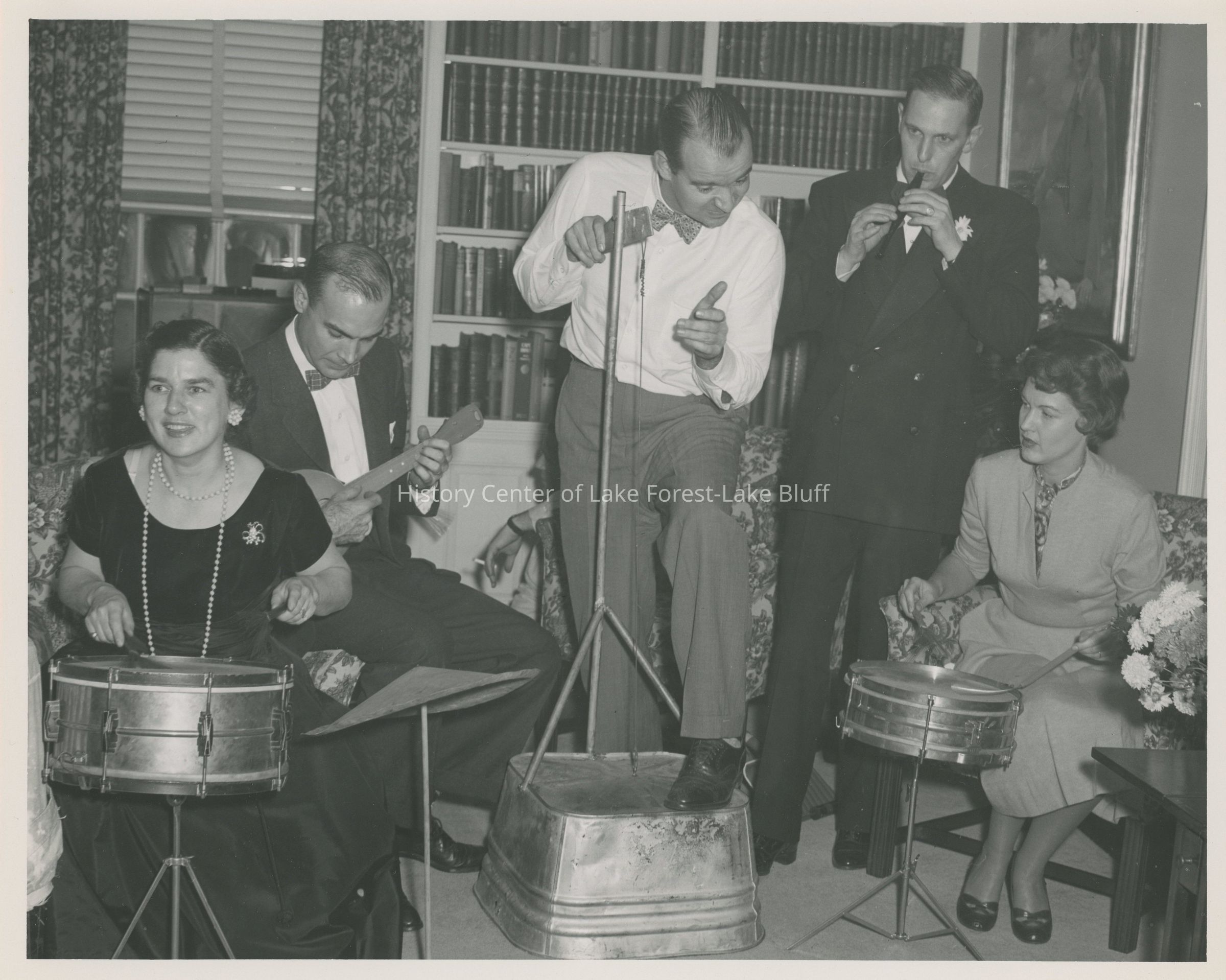 A small group photo from the Requa Family Acting Troupe and Musical Group get together. It features Mary Requa (left) and Maryann White (right) playing the drums, John Shields playing a small string instrument, Bob White playing the washtub bass, and Charlie Requa playing the recorder.