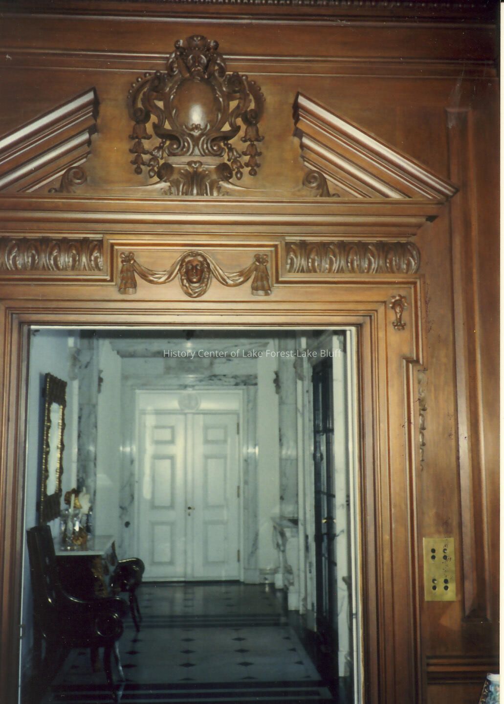 View of entrance hall through doorway with carved detailing and molding in dining room