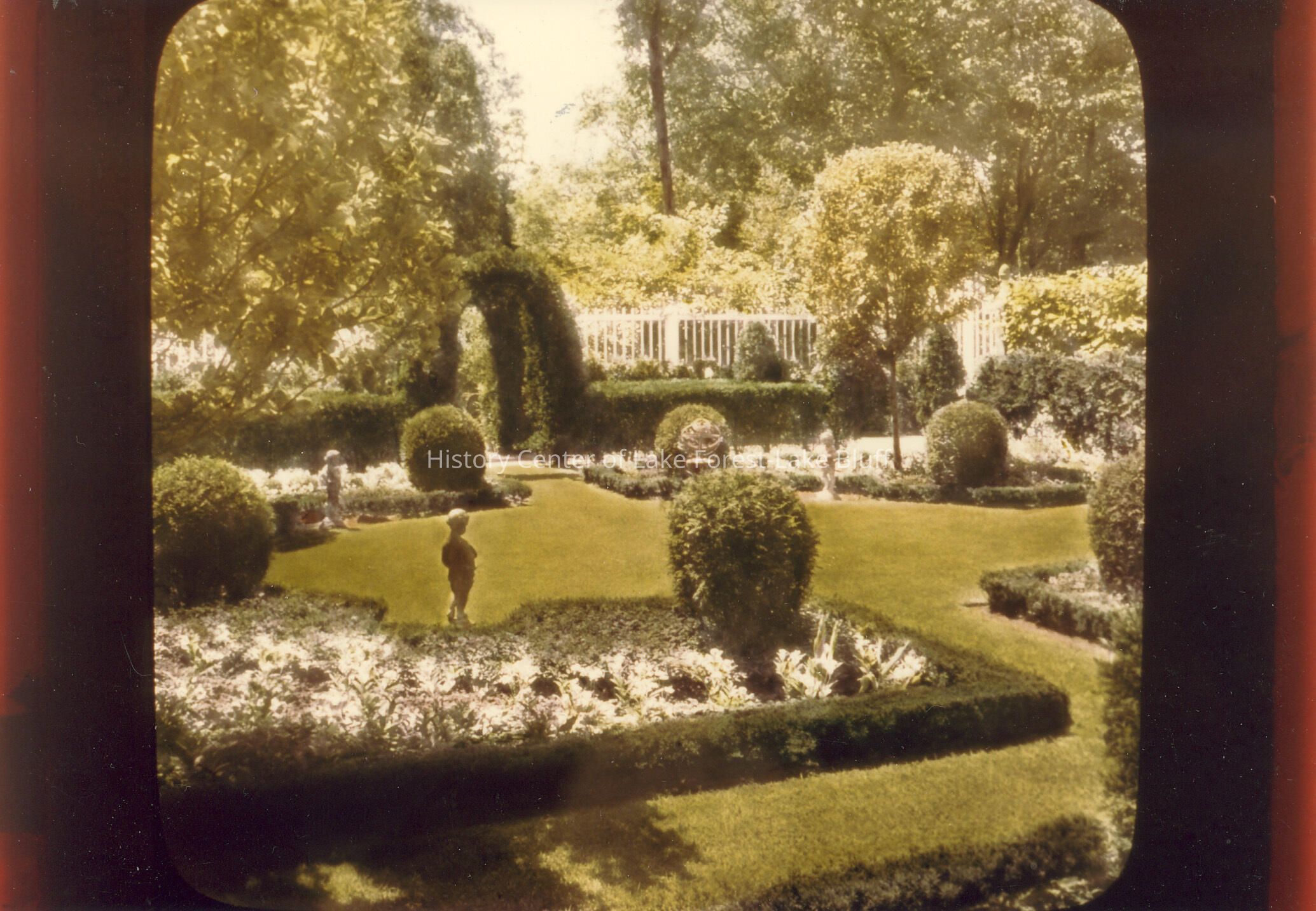 Garden with hedged beds, evergreen arbor, and statues 1421 North Lake Road; Owners: Richard Bentley and Phoebe Norcross Bentley built 1928 Architect: David Adler Landscape: David Adler; Annette H. Flanders 1435 N. Lake Coachhouse