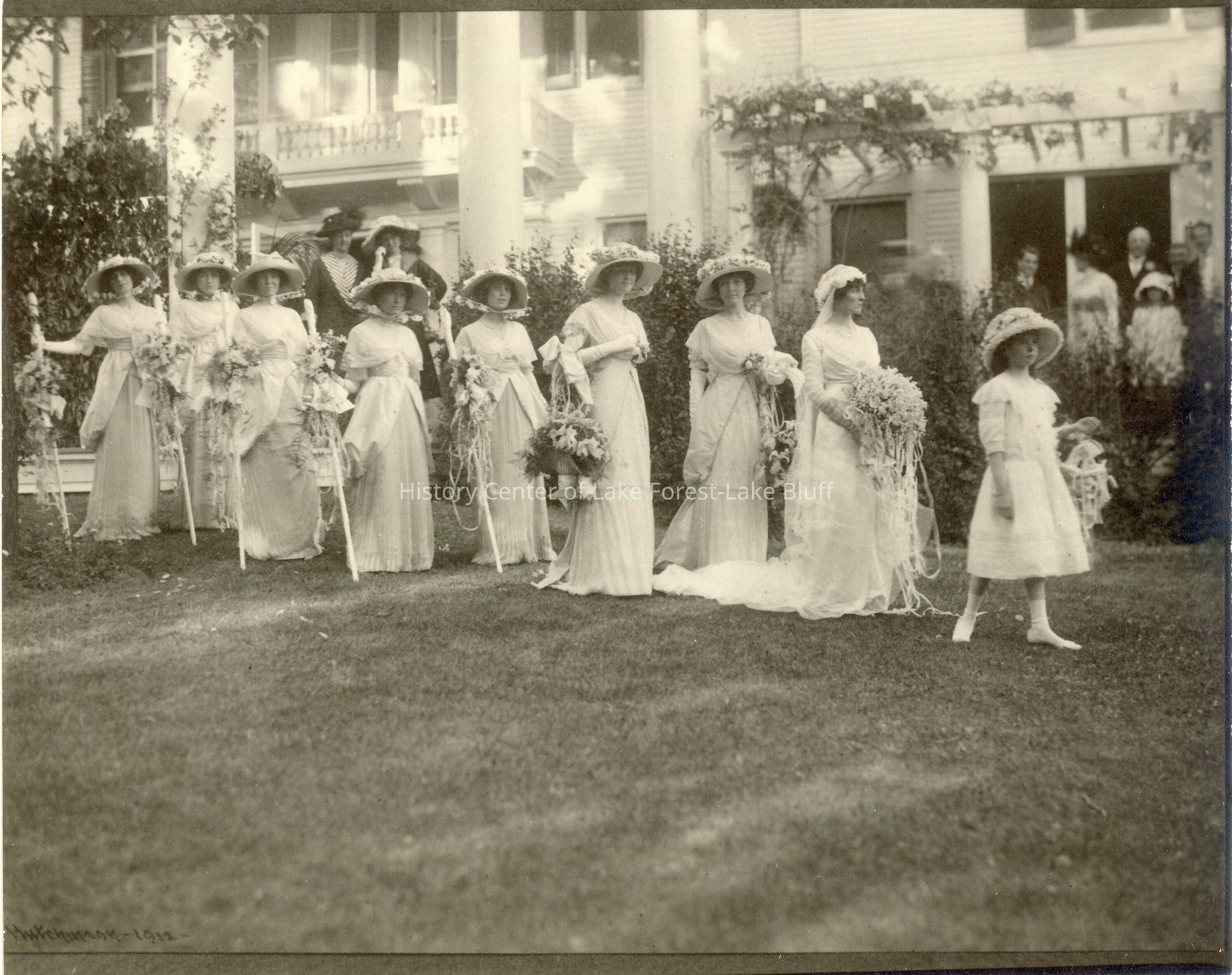 Marjorie Robbins and James M. Hopkins Wedding. The bridal party consisted of (Left to right): Helen Poole (Mrs. Rosecrans Baldwin), Jane Cook of Baltimore, Isabelle Robbins (Mrs. Charles Isaacs, Jr.), Catherine Jones (Mrs. Edward H. Bennett), Lucy Blair (Mrs. Howard Linn), Dorothy Robbins (Mrs. Frank Hibbard), Mrs. Laurance H. Armour, the bride, the flower girl was Frances Robbins (Mrs. William R. Odell). Mrs. Odell, Mrs. Isaacs and Mrs. Hibbard are all sisters of the bride. The bride became Mrs. James M. Hopkins of N. State Pkwy. This information is from a copy of a newspaper article with the photo. Home SE corner of Illinois and Mayflower