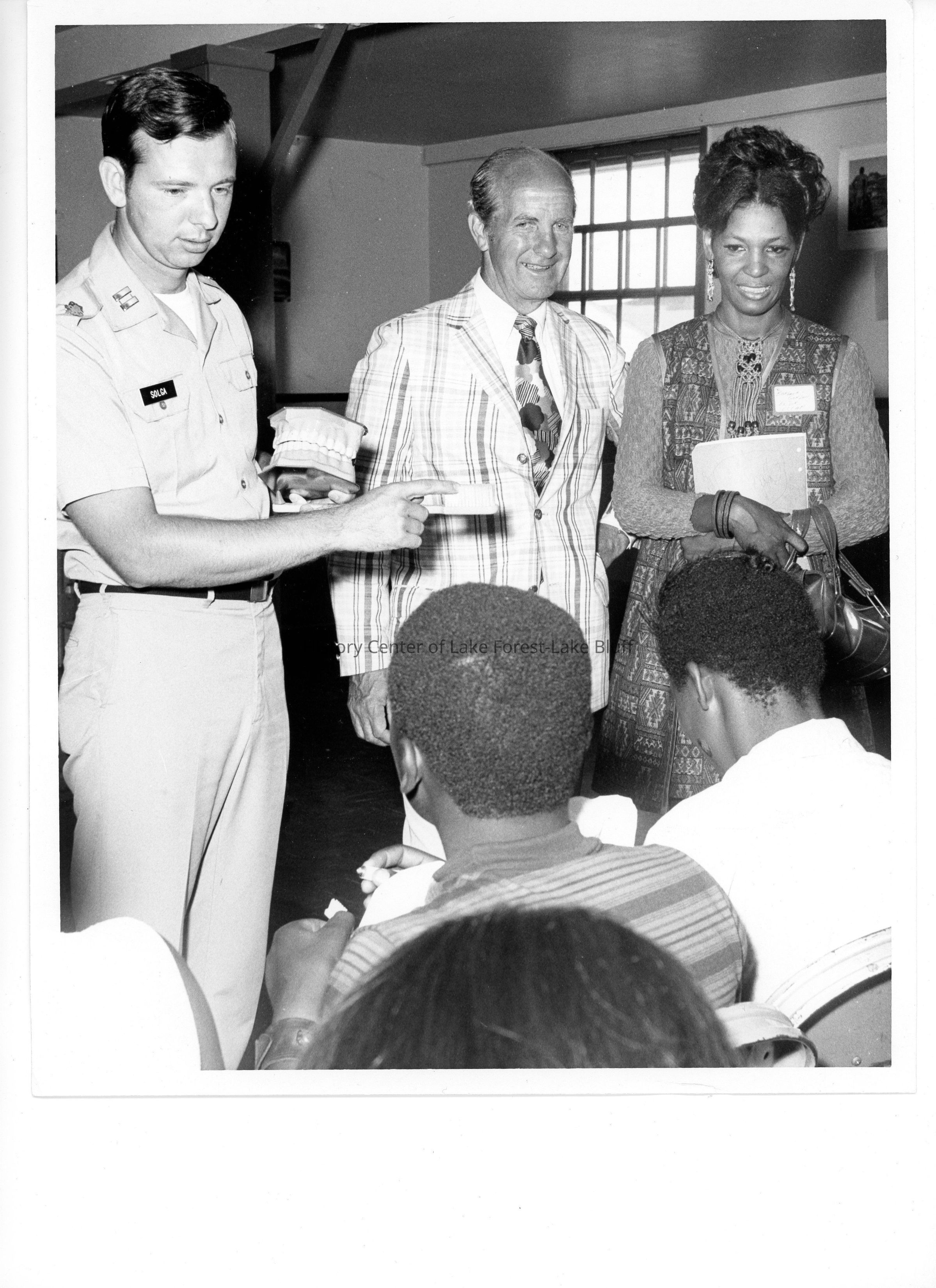 "Congressman Robert McClory (R 12th) was at Fort Sheridan today to visit with Project Aware youngsters. Congressman McClory and Mrs. Barbara Gordon, director of Lake County Community Action Project and a coordinator for Project Aware, observe Captain Francis G. A. Solga, Dental Officer, Dental Detachment, Fort Sheridan, instruct children of Project Aware on proper way to brush teeth."Photograph Details
