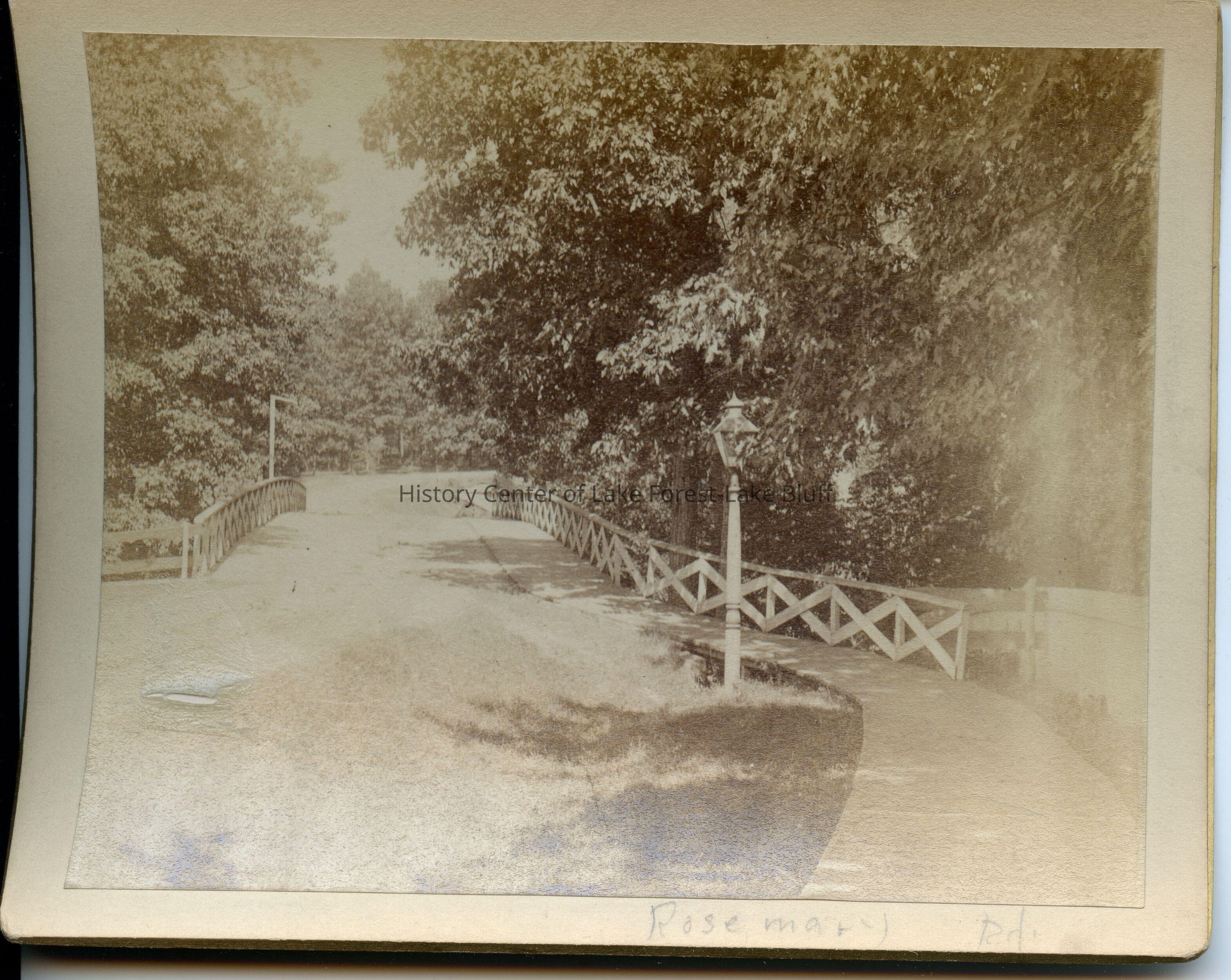 Sepia tone photograph of road, wooden sidewalk, bridge, and streetlamps. "Rosemary Road" written at bottom. "Holt" written on back. May be from Holt family.