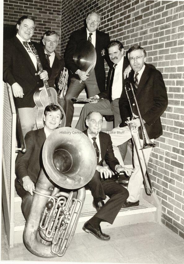 Samuel Dent Memorial Jazz Band in a Deerpath School stairwell members: Scott Meland, trombone