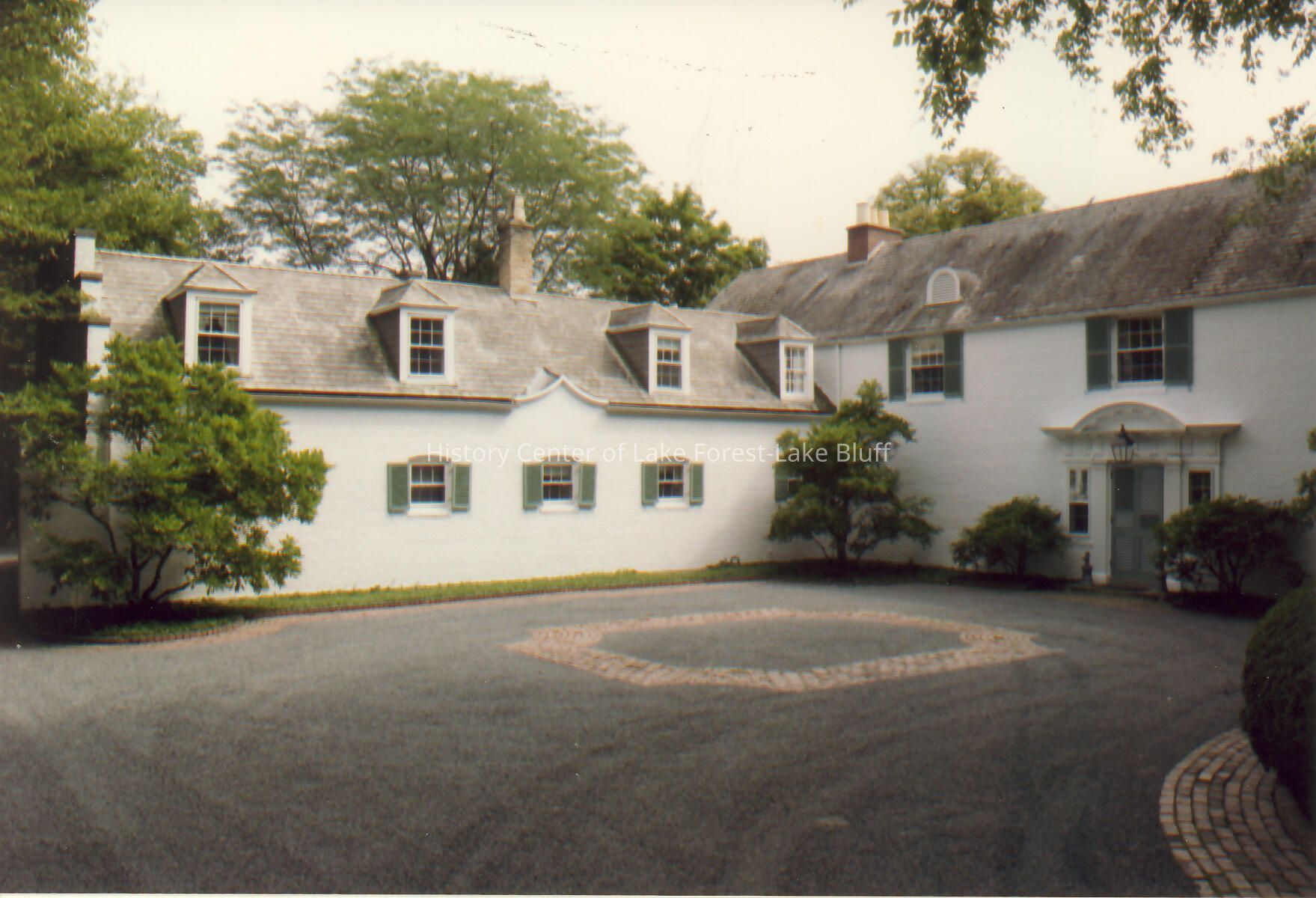 Exterior view from drive way of Walter Frazier home built for Samuel J. Walker Jr. in 1927. Located at 3 S. Green Bay Road in Lake Forest, Illinois.