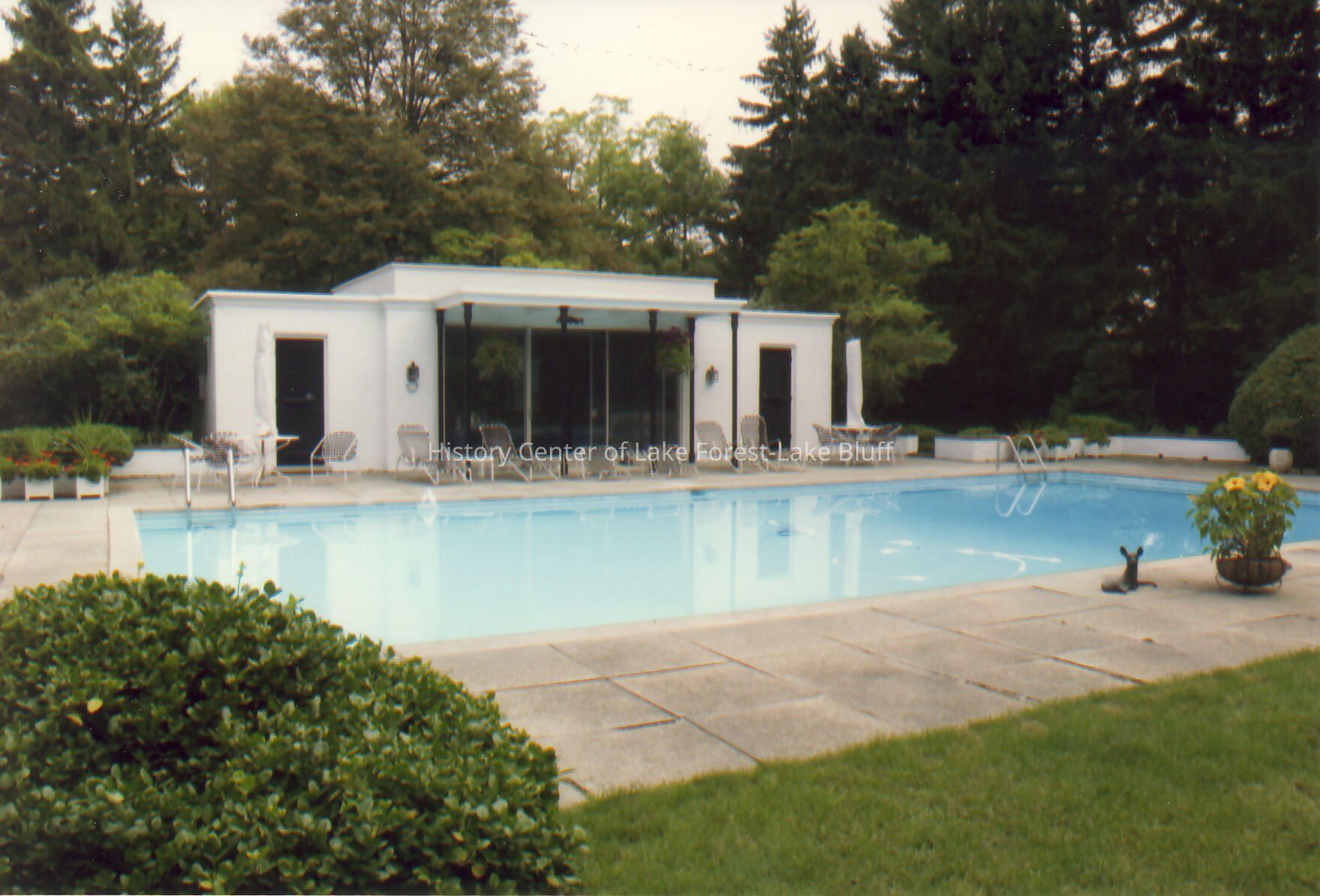 Pool and pool house exterior of Walter Frazier home built for Samuel J. Walker Jr. in 1927. Located at 3 S. Green Bay Road in Lake Forest, Illinois.