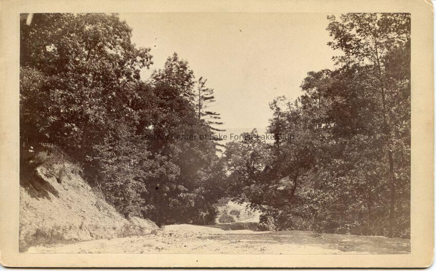 Sepia tone photograph looking downhill through a ravine (?). Fence visible on left hill through the trees. Lake may be visible in the rear. Handwritten on verso "Ellen Holt"?