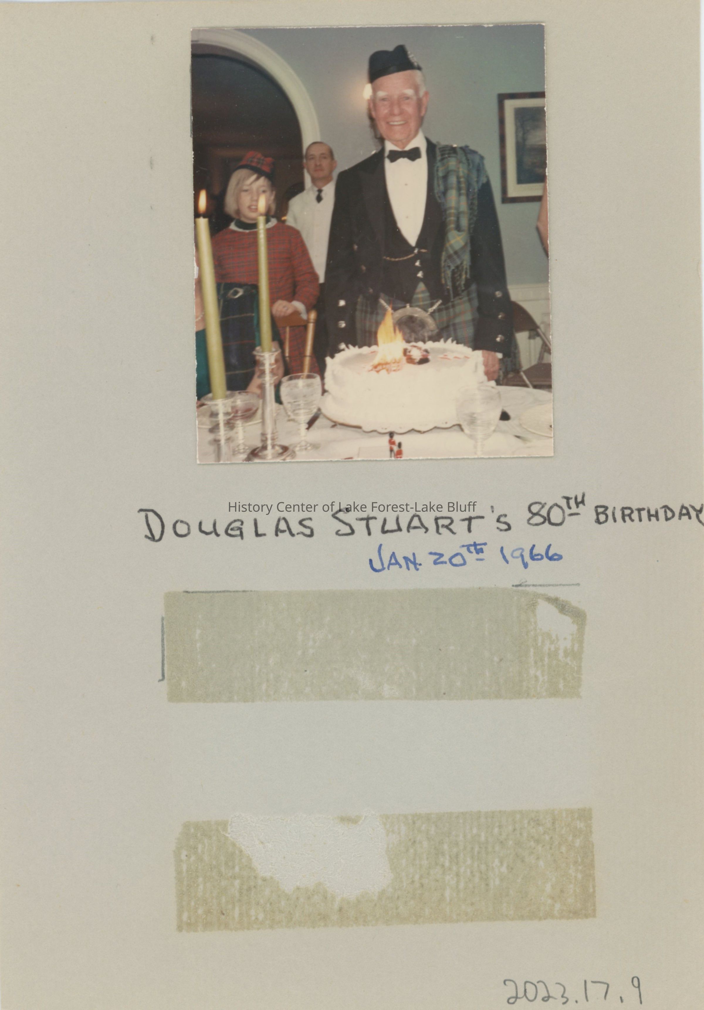 A page that has been cut out of a larger scrapbook collection. Features 3 separate photographs from Douglas Stuarts 80th birthday party, which took place on Jan 20th 1966. The fourth image was missing at time of accession, and it likely still with donor.