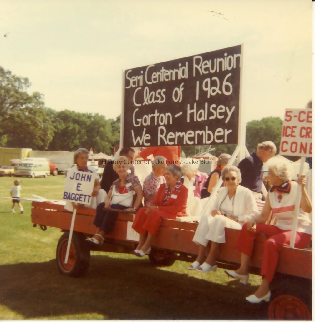 Color photograph of the Semi Centennial Reunion of Gorton-Halsey Class of 1926. Lake Forest Day, August, 1976. Parade float with a large black sign with white letters "Semi Centennial Reunion Class of 1926 Gorton-Halsey We Remember." Several classmates are seated on the card holding signs "John E. Baggett" and "5 Cent Ice Cream Cones"