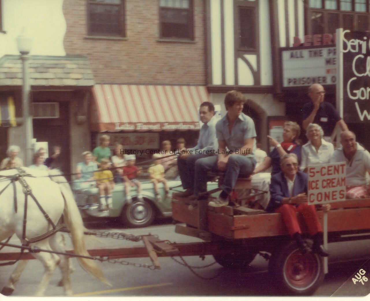 Color photograph of the Semi Centennial Reunion of Gorton-Halsey Class of 1926 August, 1976. Parade card with a large black sign with white letters "Semi Centennial Reunion Class of 1926 Gorton-Halsey We Remember." During the parade - on Deerpath in front of Lake Forest Jewelers and Deerpath Theater.