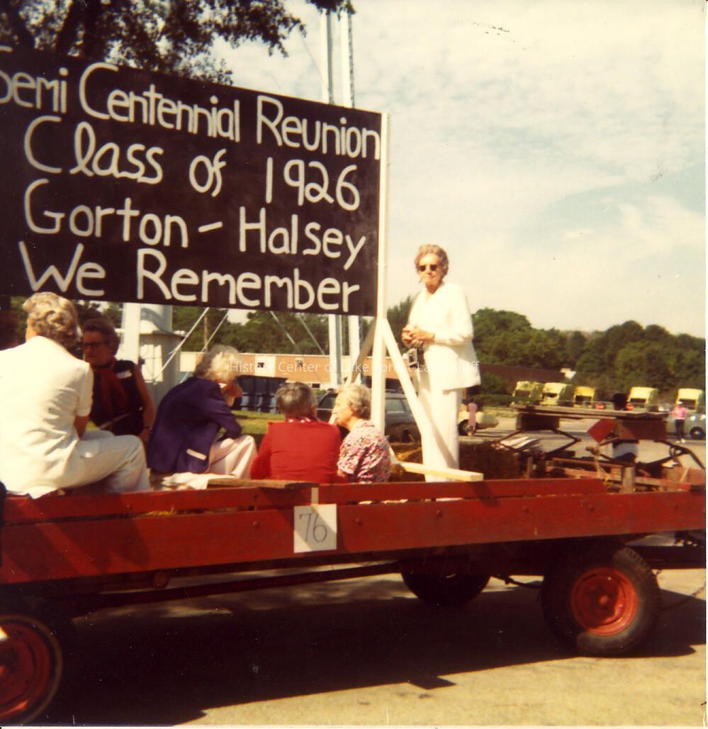 Lake Forest Day, August, 1976. Parade float with a large black sign with white letters "Semi Centennial Reunion Class of 1926 Gorton-Halsey We Remember."