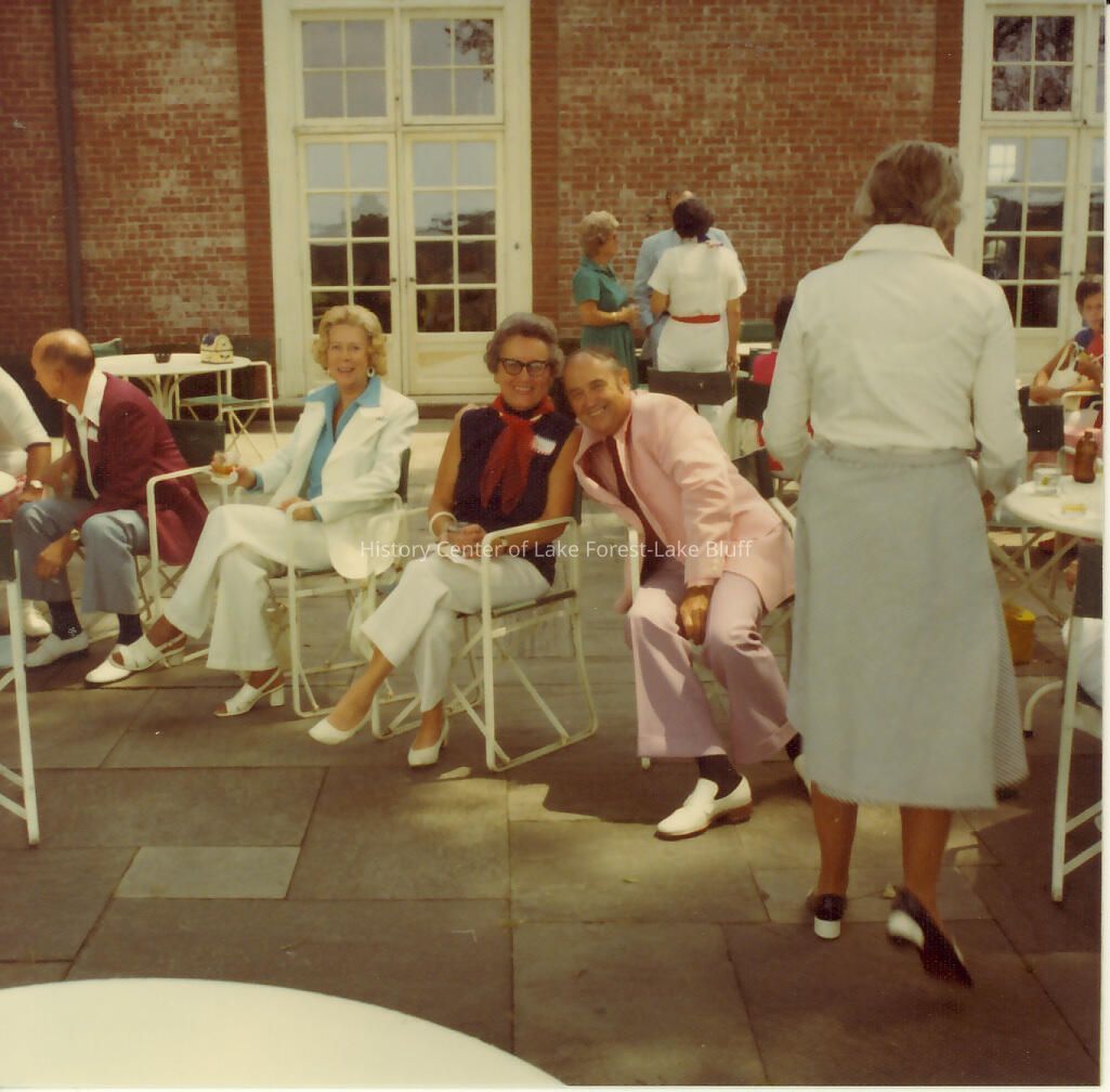 Color photograph of alumni lunching at a garden party. Lake Forest Day, August 1976, probably after the parade same image as 2003.13.23