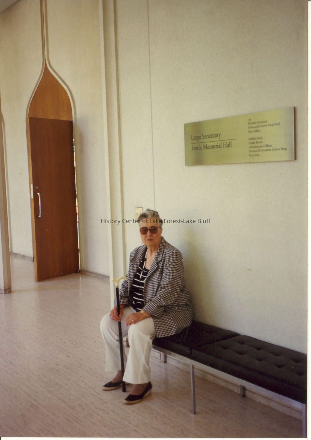 North Shore Congregation Israel, Glencoe. Woman sitting on a bench, wearing white pants, striped black and white shirt and checkered black and white blazer. She's holding a cane and wearing sunglasses