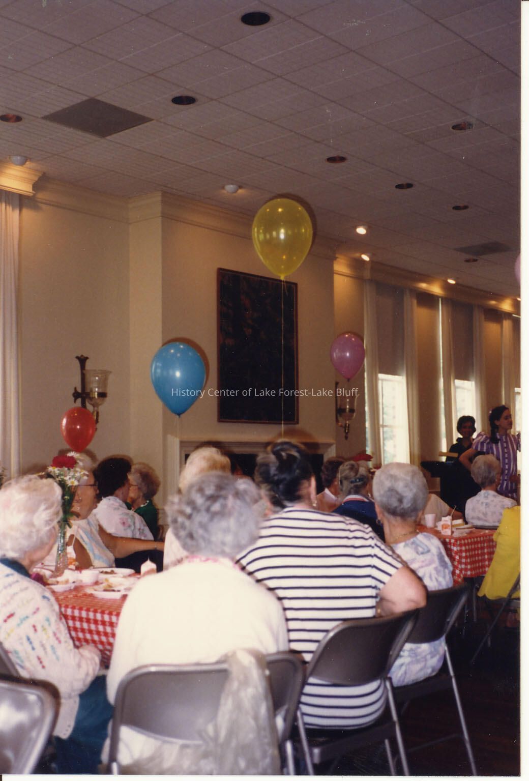 Ladies sitting at tables, with balloons