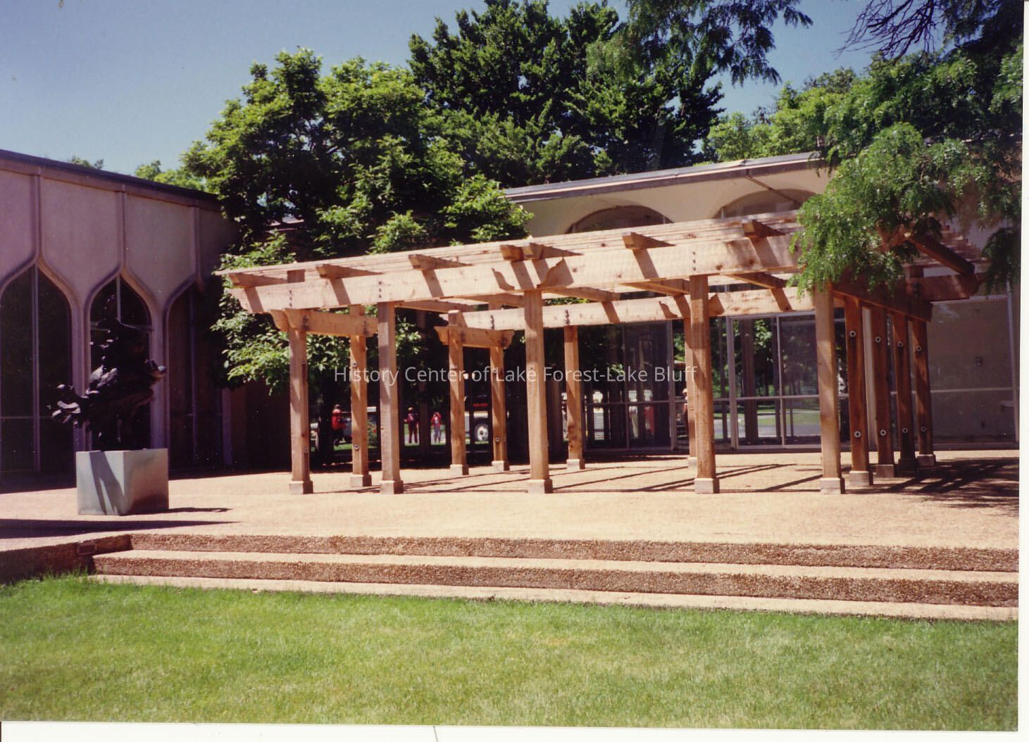 View just outside of North Shore Congregation Israel, Glencoe- courtyard like with wooden trestle for shading