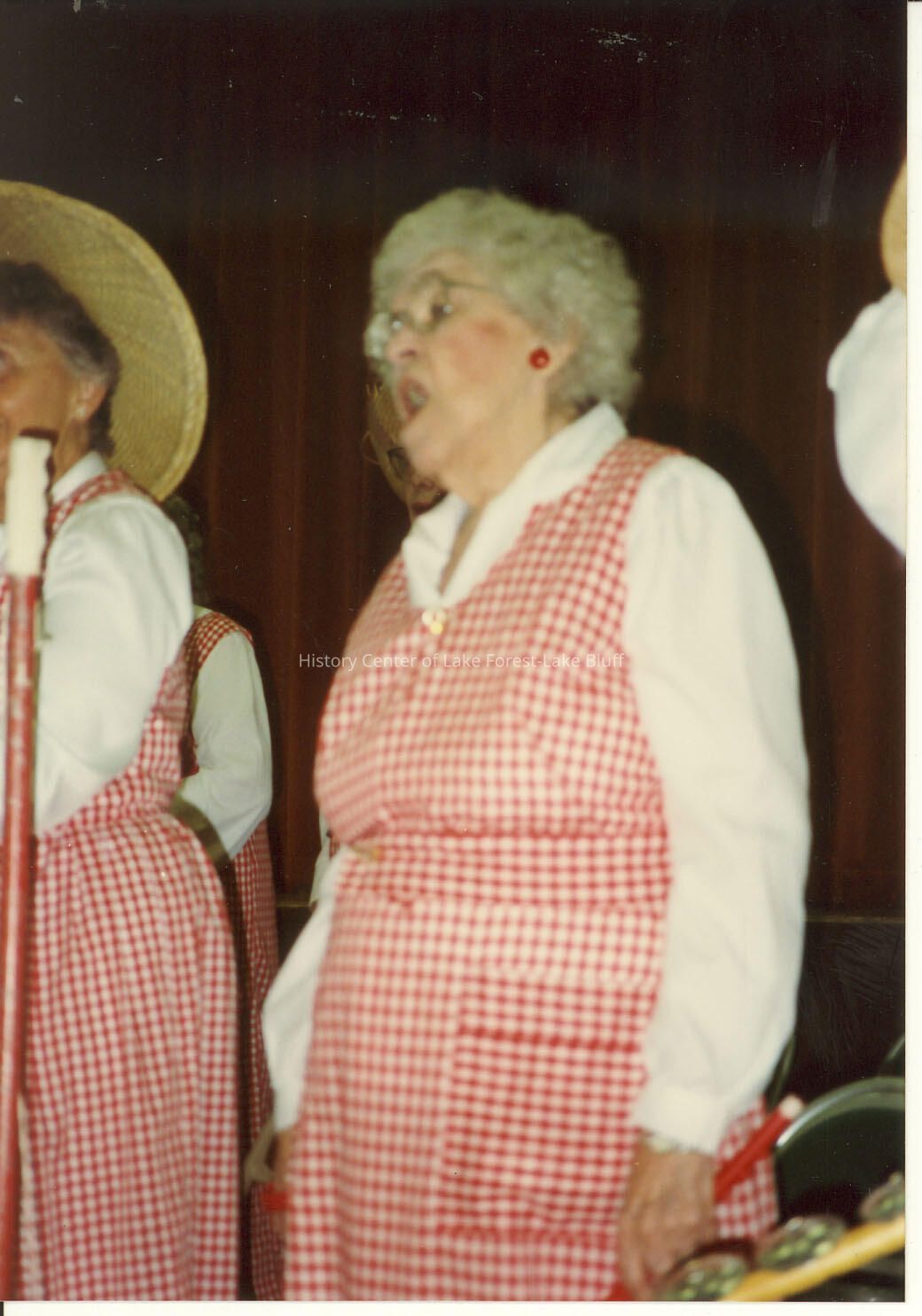 Senior lady singing; wearing red and white gingham jumper and white shirt