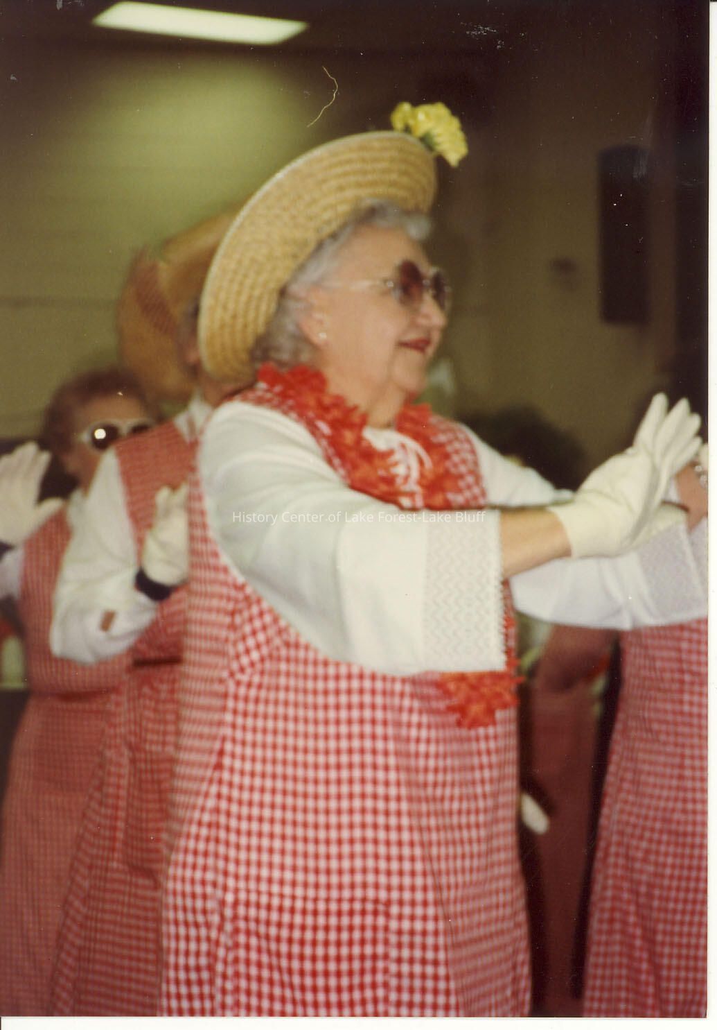 Senior ladies doing group dance; wearing red and whilte gingham dresses.