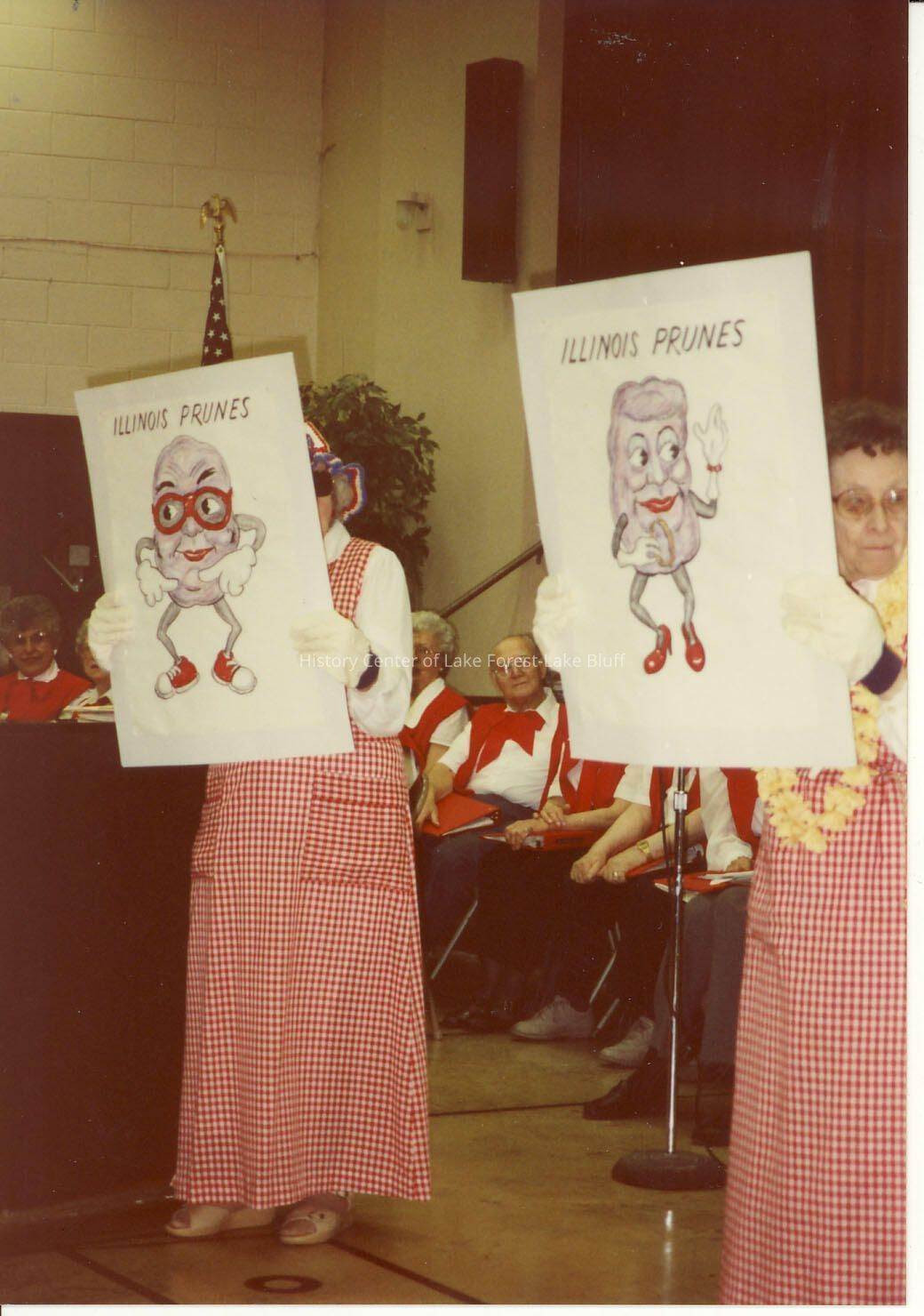 Senior ladies dancing and holding up sign: Illinois Prunes