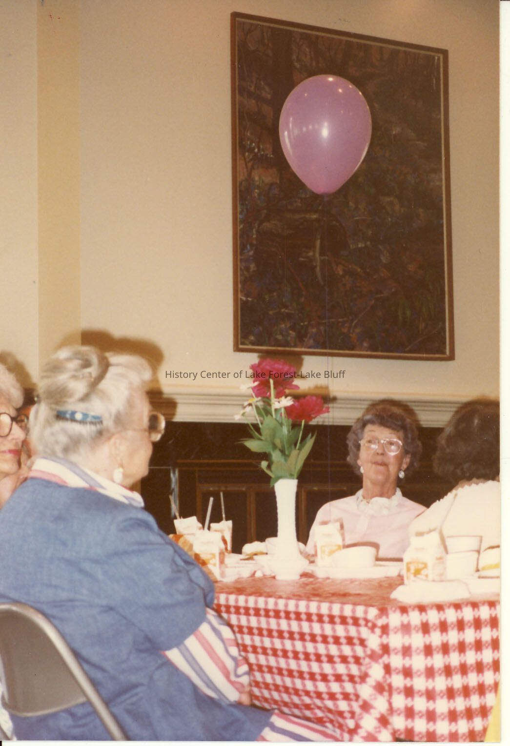 Candid table shot of women sitting at a table, pink balloon above, might be a celebration