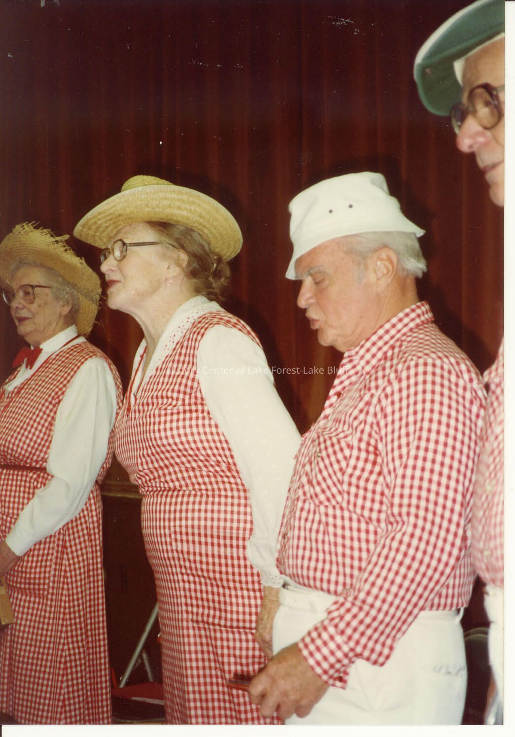 Seniors singing, wearing red and white gingham shirts and jumpers