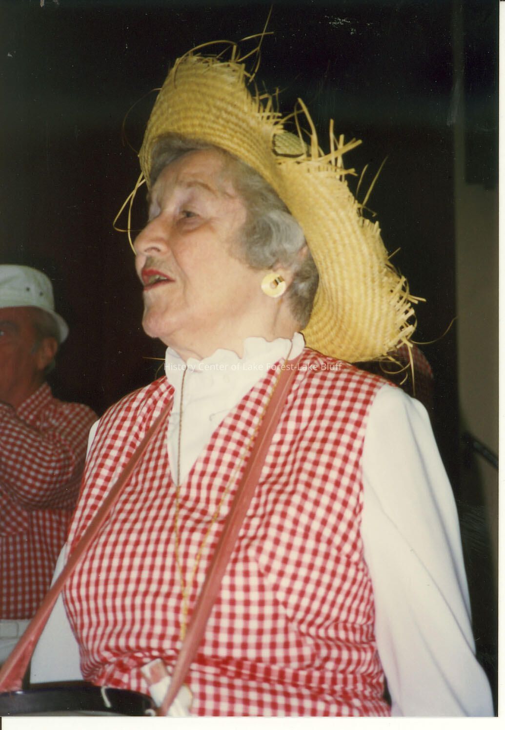 Senior lady singing, wearing red and white gingham jumper and straw hat