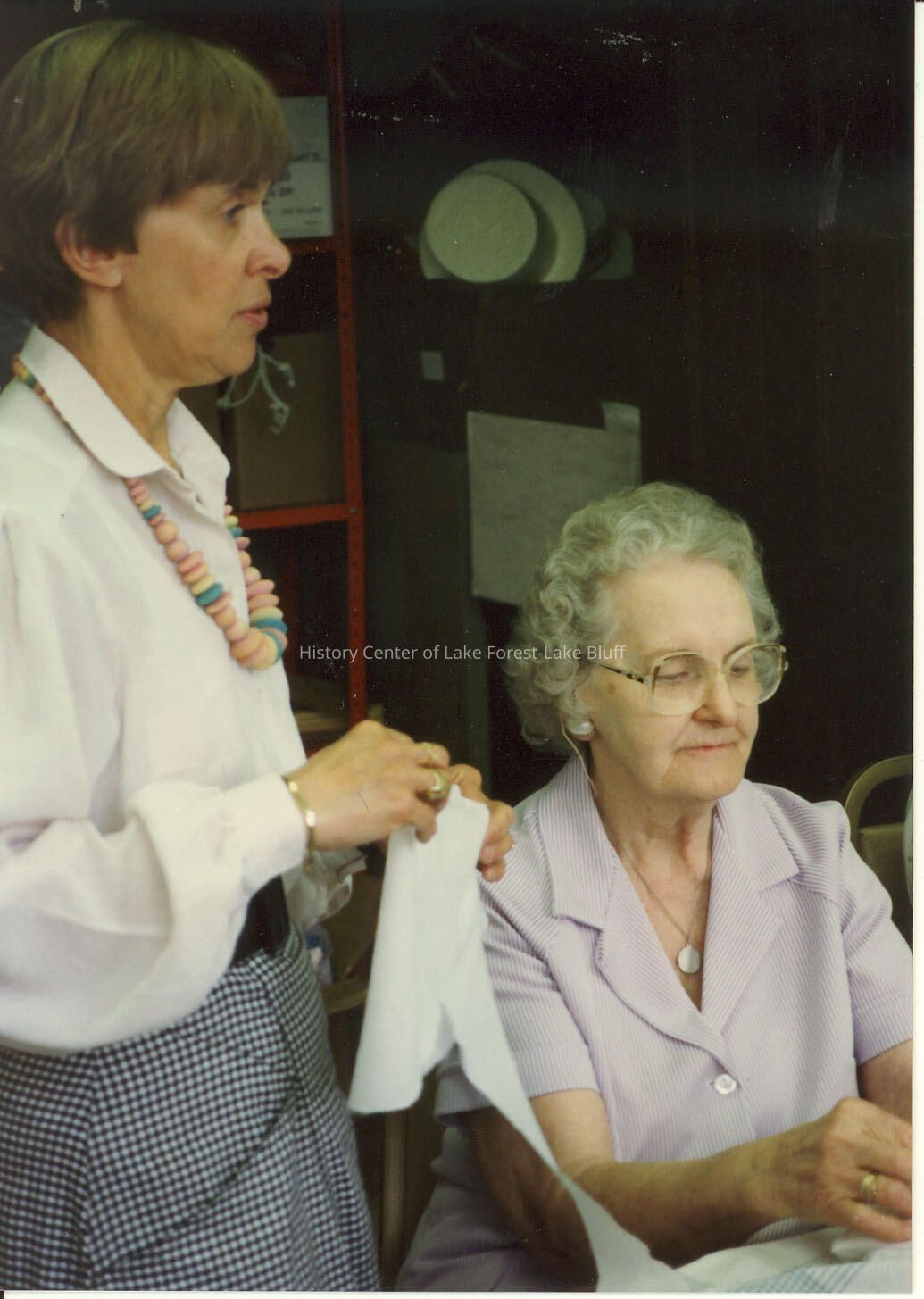 Senior lady sewing and Joyce Foster watching.