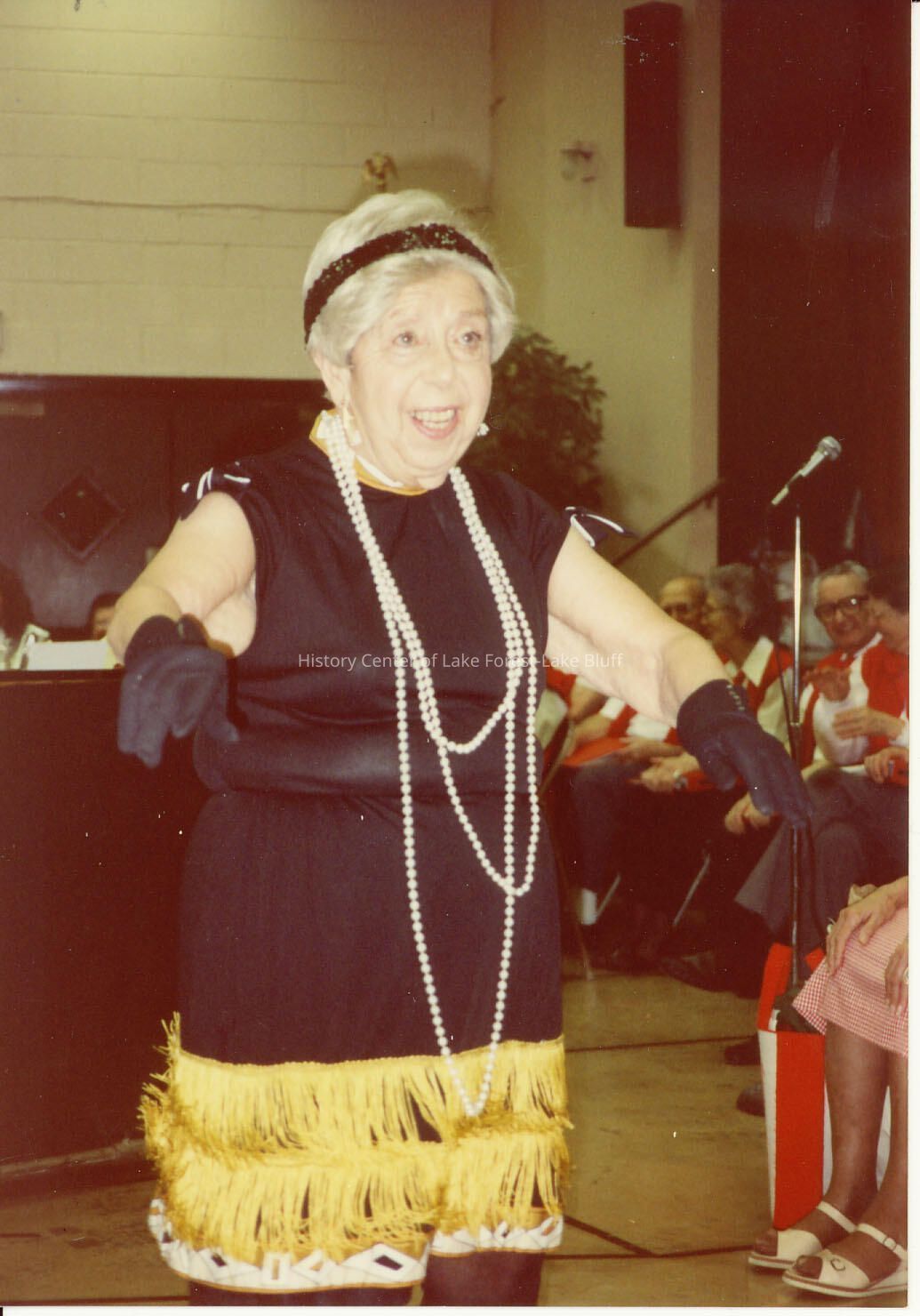 Woman at country western themed event in 20's flapper costume, wearing black dress, black gloves, and white strings of pearls