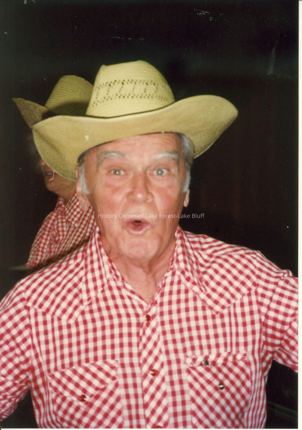 Man in red and white gingham cowboy shirt dancing, wearing a straw hat