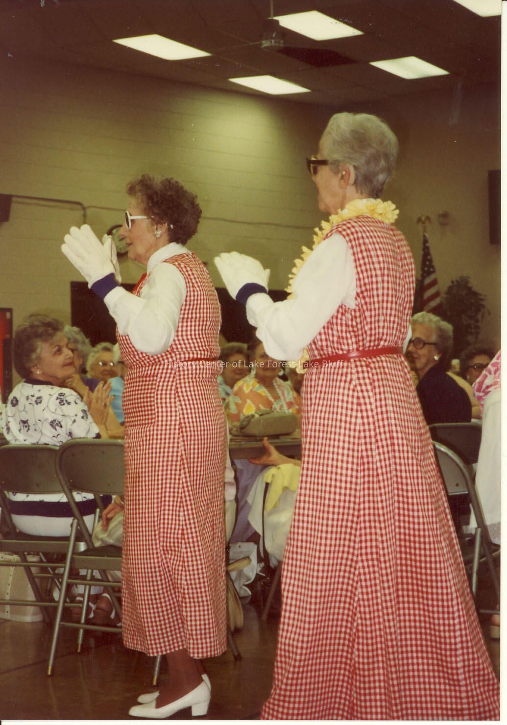 Two women of the Illinois Prunes dance group entertaining a group of seniors