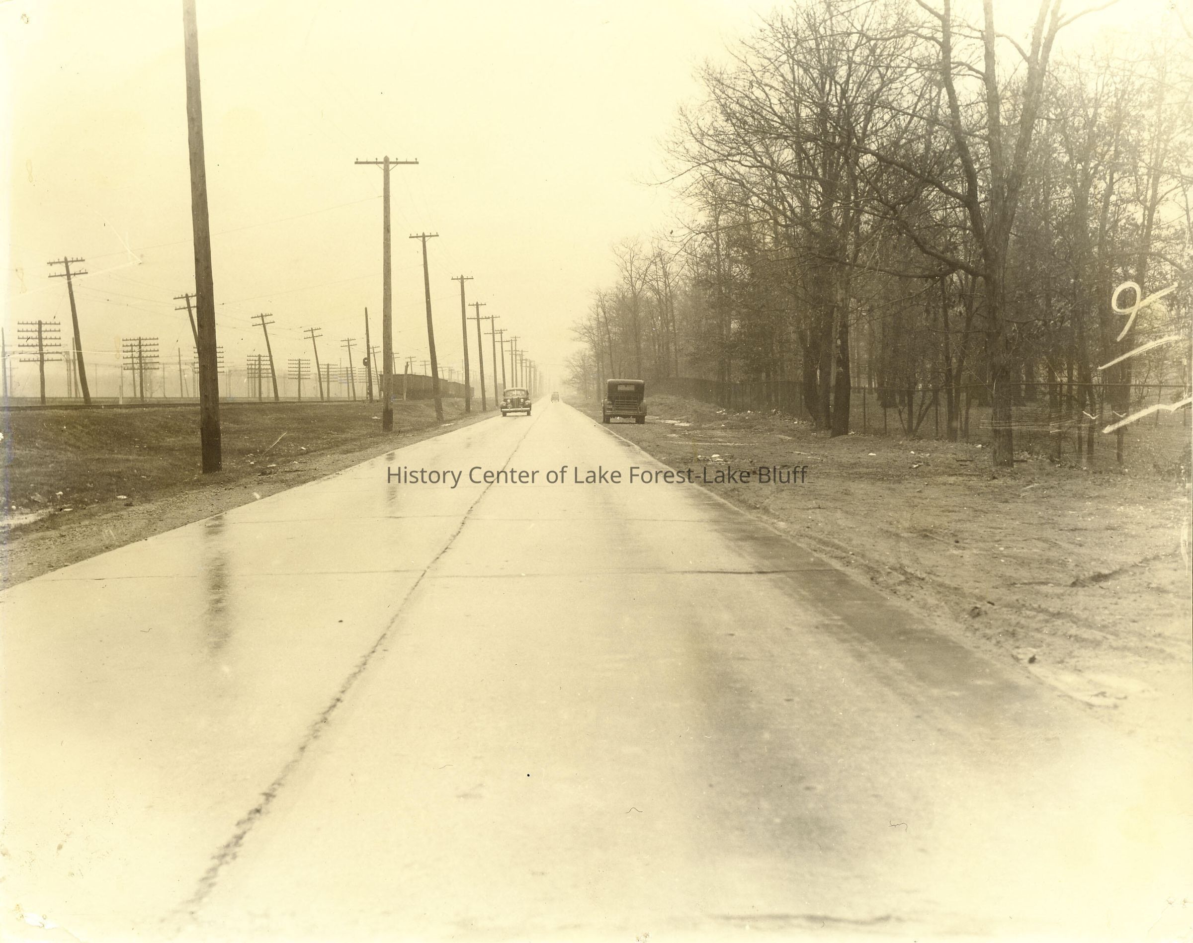 View of Sheridan Road looking north, north of Lake Bluff. There is fence along one side and railroad tracks on the other side, with freight cars visible. There are cars on the road and one parked on the side of the road. Similar to 2005.66.89 but opposite direction.