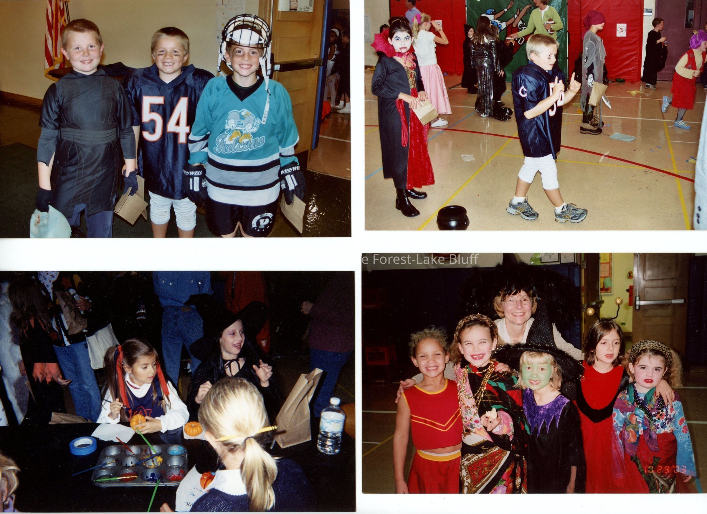 4 photos from the Sheridan School 2004 Halloween party. Top Left (L to R): Joseph [Egan ?], Nicholas Athenson, Logan Harper.