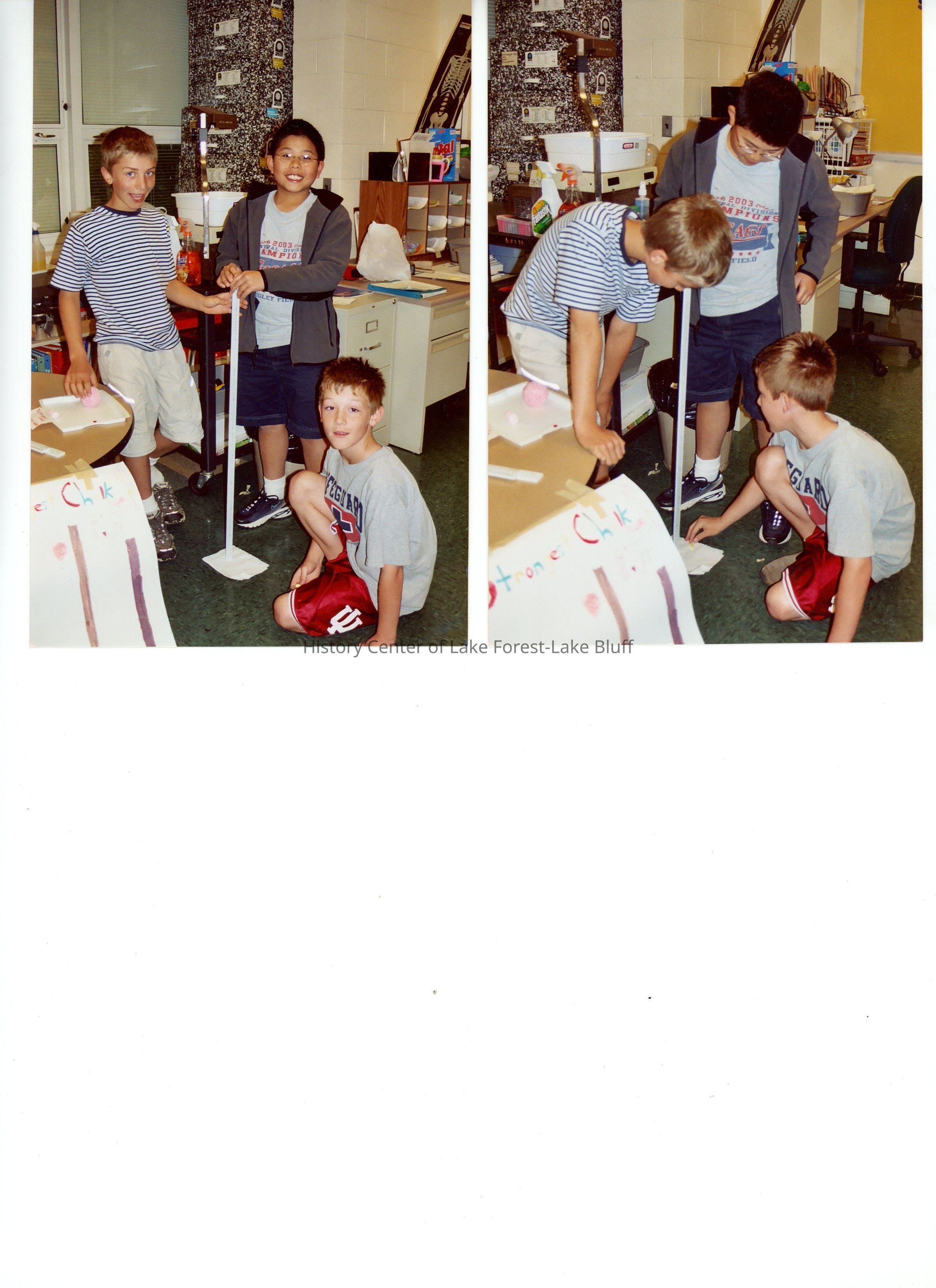 Photo of 4th graders (2004) performing a science experiment. L to R: Alex Athenson, Cuyler Lam, Owen Williams.