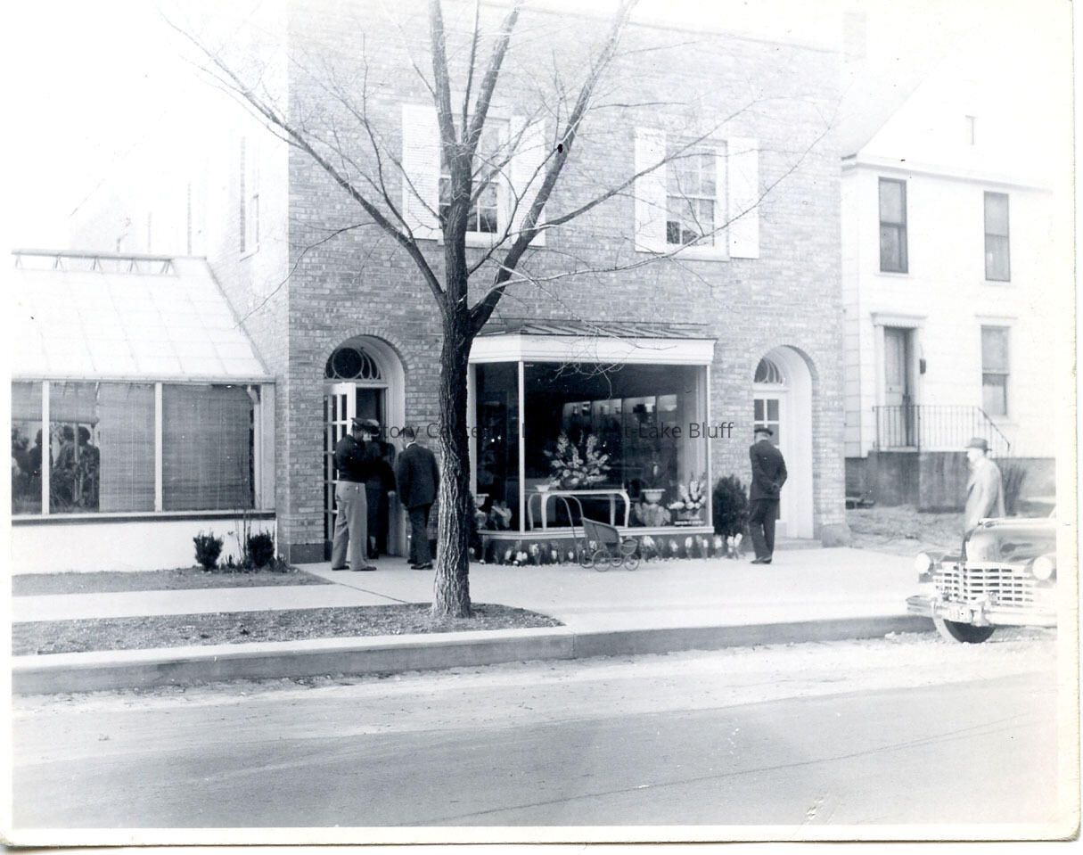 Picture of unidentified building "next to remodeled corner house" on Westminster in Lake Forest. Appears to be a florist shop - could be Herman R. Jahnke, Florist, located at 194 E. Westminster in 1950 directory.