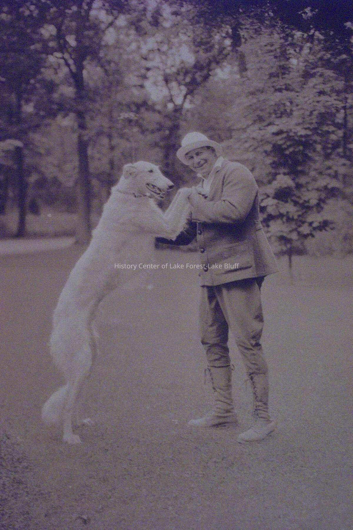 Portrait of Sidney Smith with dog (standing on hind legs) on the lawn at Lake Geneva