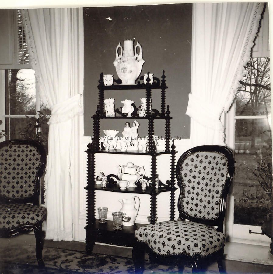 Interior image of 2 chairs, heavy white drapes. 2 large windows, overlooking Deerpath (?). 5 shelf what-not stand with various display items, e.g., ornate small vases, small porcelain figurines, porcelain teacups, other small sculptures.
