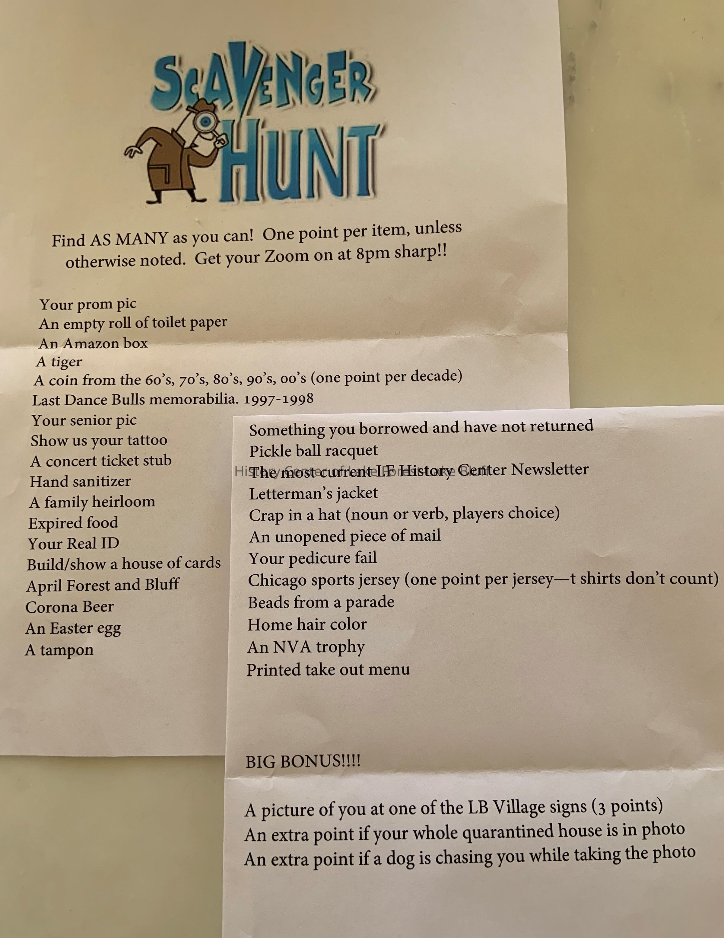 Nini Lustig: "My friends Carol Mark of Lake Bluff and Mary Bauder of Lake Forest planned this awesome scavenger hunt to do in quarantine. They dropped off the clues on our driveways at 7:30 pm and we had until 8pm to hunt through our homes and then join a Zoom chat for show and tell. A fun and creative way to spend a Friday night with friends."Photograph Details
