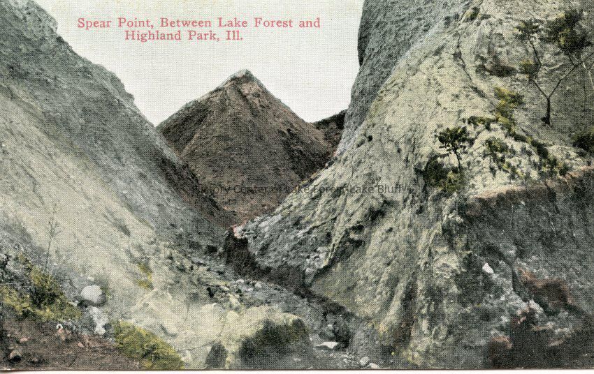 Colorized postcard of Spear Point, Between Lake Forest and Highland Park, Ill. Image of a rocky point and ravine.