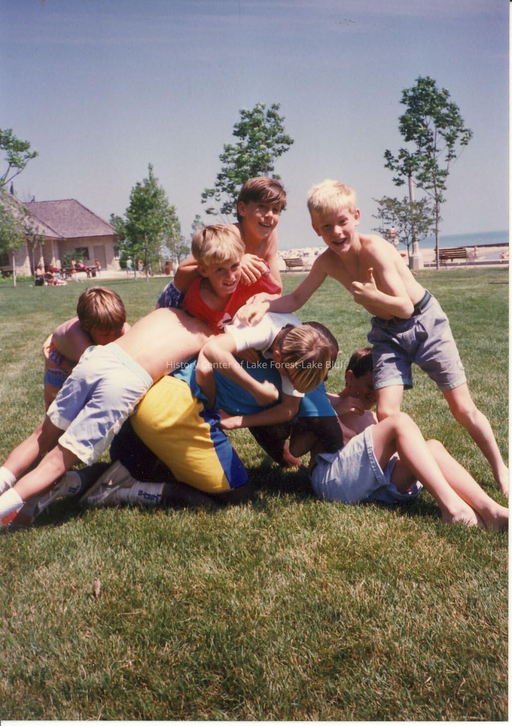 Boys playing on the grass- climbing on each other, wearing swim trunks, most are not wearing shirts at Forest Park beach.
