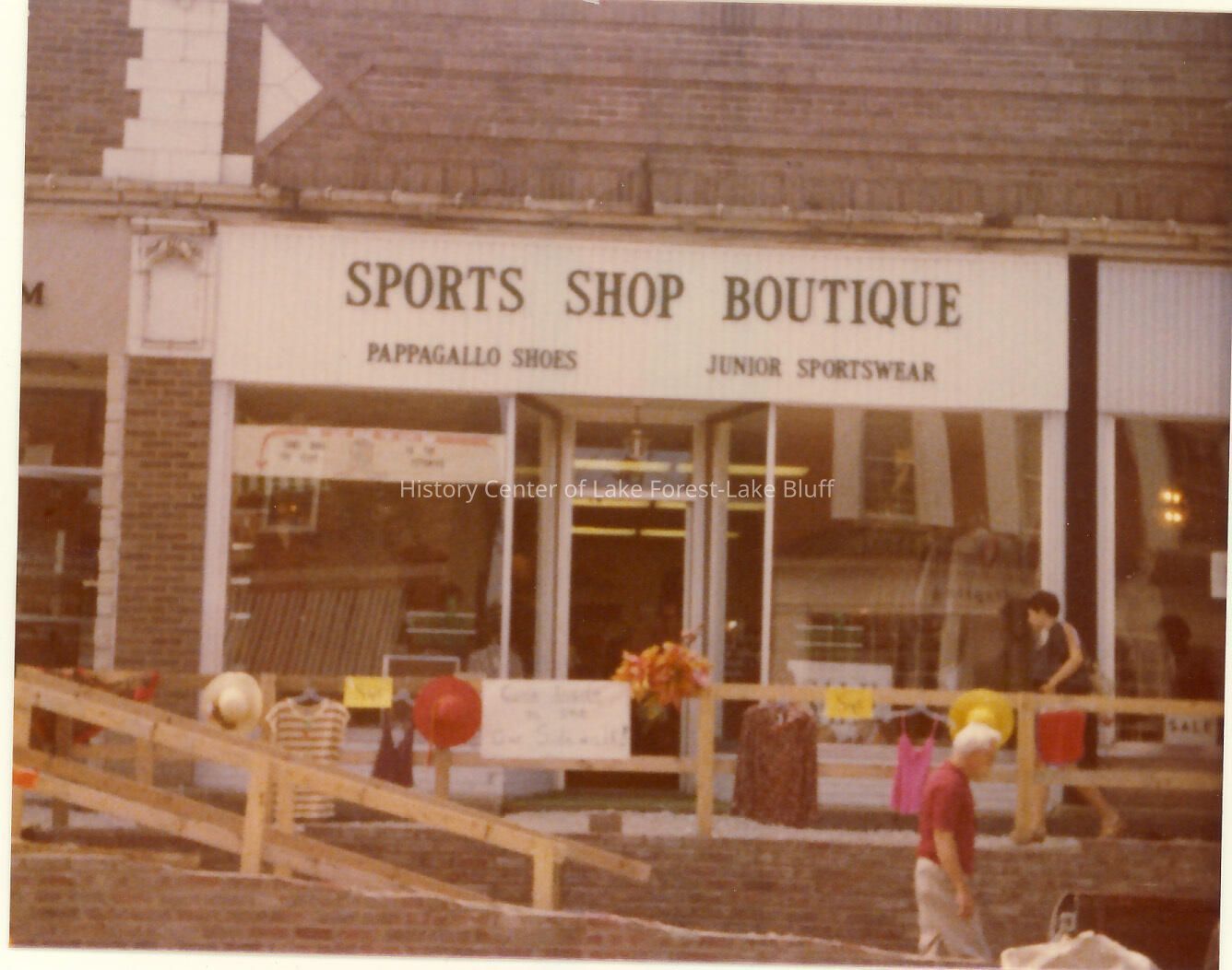 Several snapshots of Sports Shop in two envelopes. Hinsdale location. July 1979. Construction is being done on the exterior of the whole retail complex.