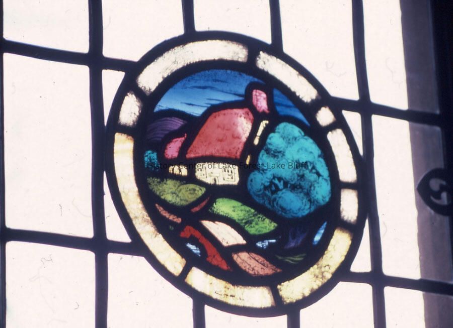 The stained glass window depicts a charming cottage surrounded by a tree and rolling hills in vivid colors.