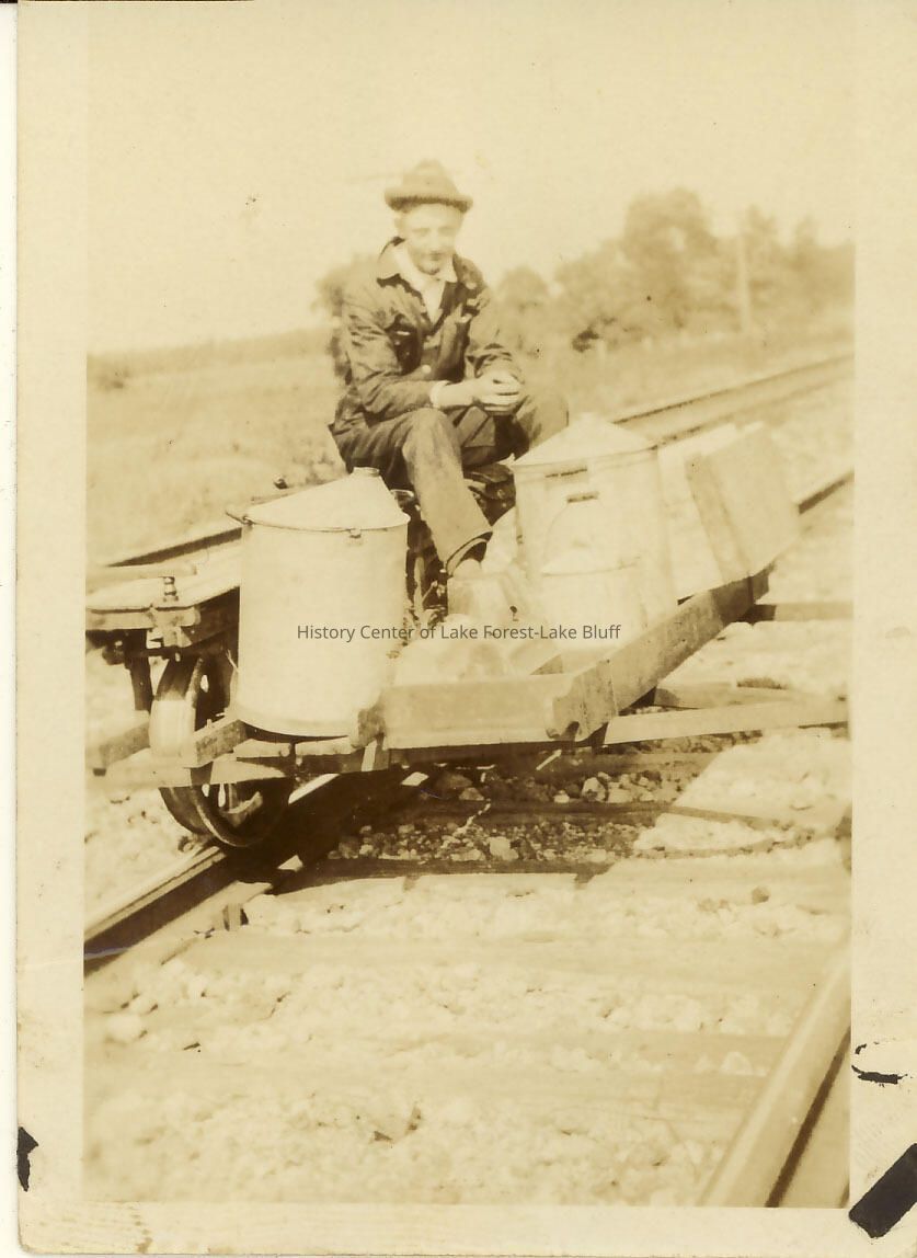Stanley Wells Photograph album of toy trains, many of which were taken at the Donnelly Farm Black and White man sitting on single rail equipment cart