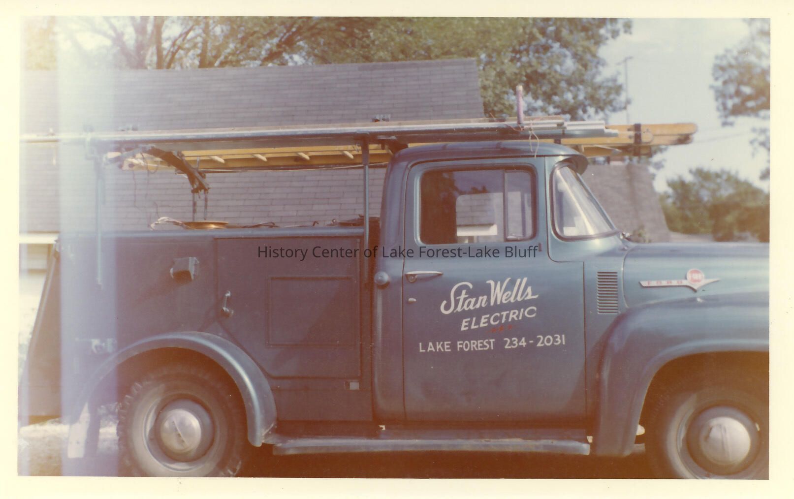 Color photograph of blue Ford truck with yellow ladder on top. With Stan Wells Electric on the side Back states: Stanley Frederick Wells Buried L.F. Cemetery Born 1907 Died 1991 Lived at 1275 Edgewood, Lake Forest