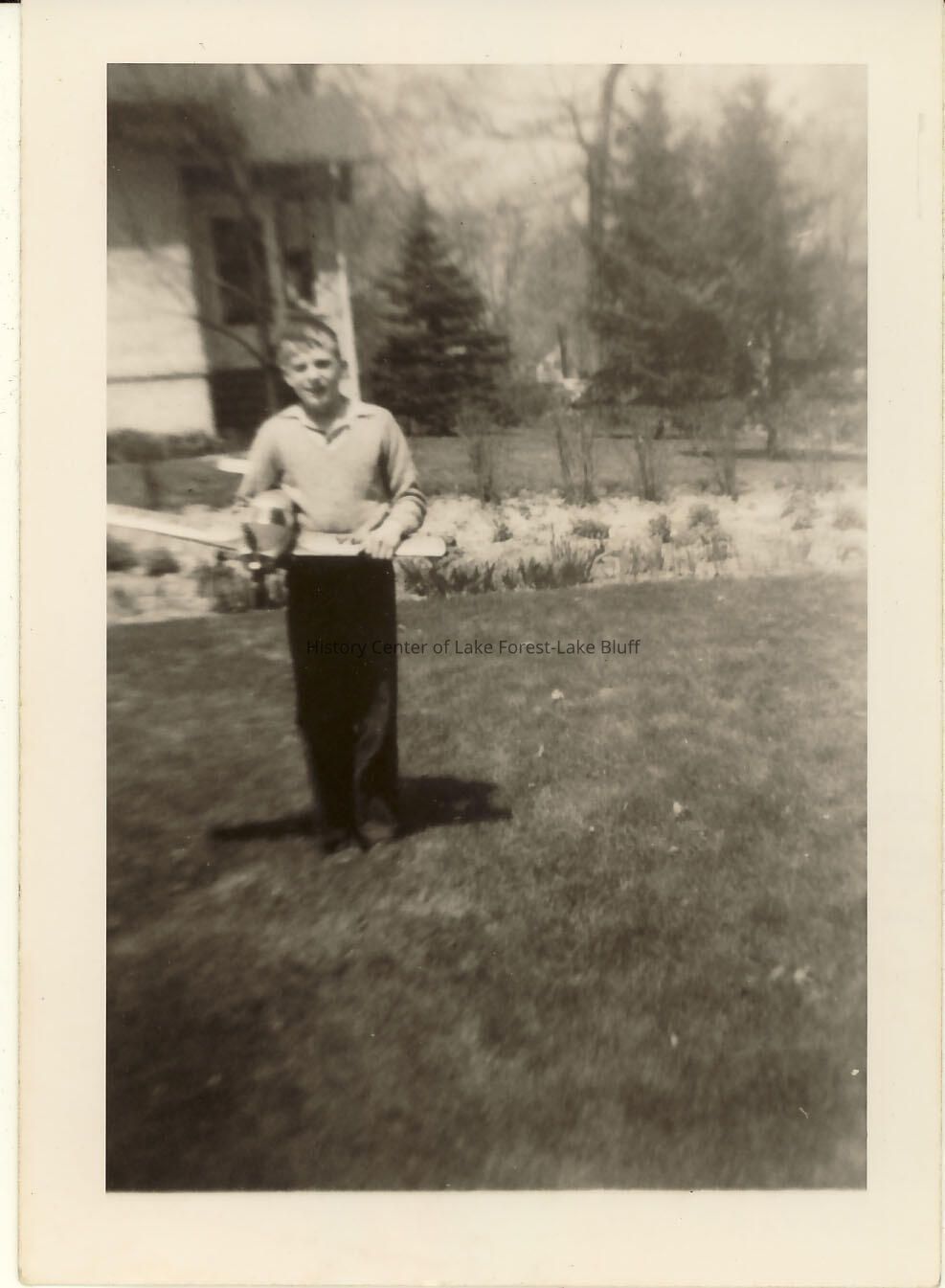 Black and white image of Stanley Wells, Jr. standing with model airplane in front of house 1275 Edgewood in Lake Forest. 1940s.