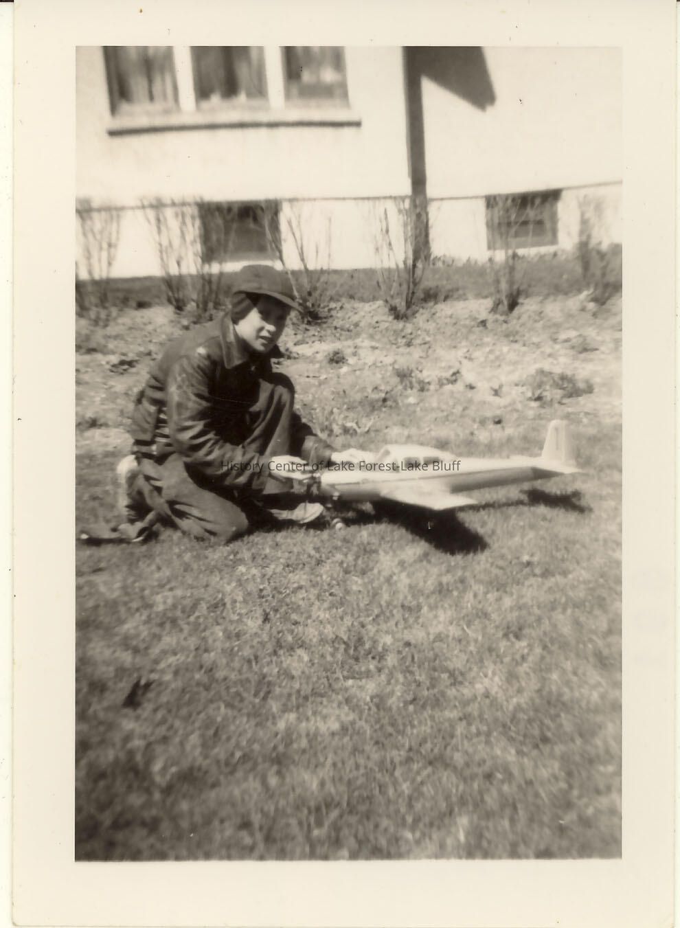 Black and white image of boy kneeling with model airplane facing his knee. Stan Wells, Jr. in front of house at 1275 Edgewood in Lake Forest. 1940s.